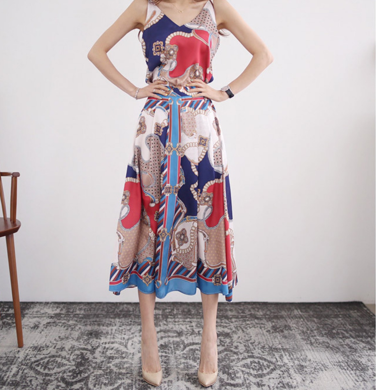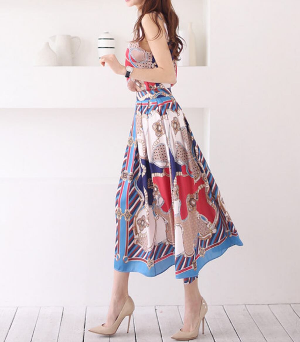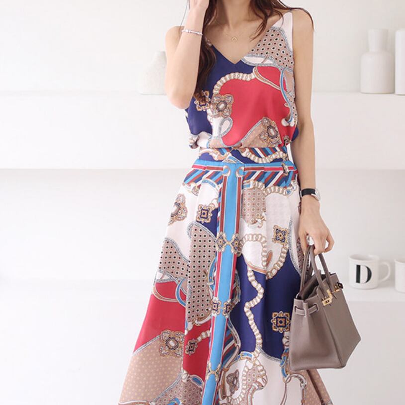 高級感のある大きめなプリントのマキシキャミワンピース。