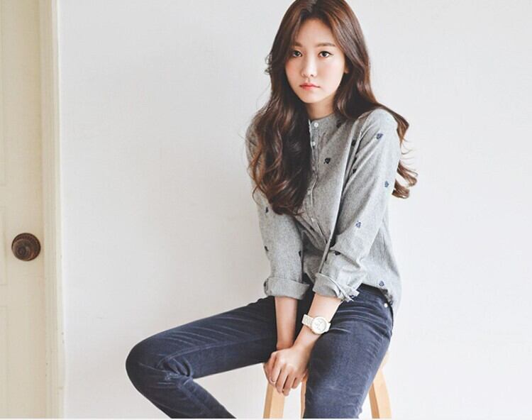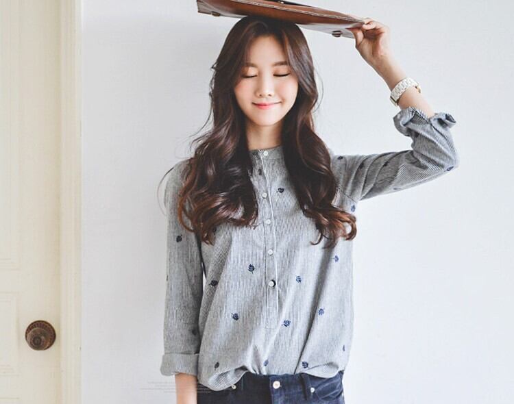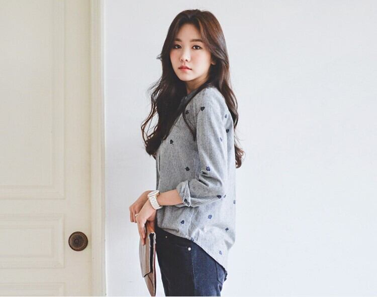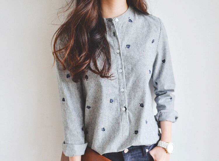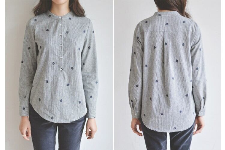リーフの刺繍がさりげないシンプルでかわいいカジュアルシャツ