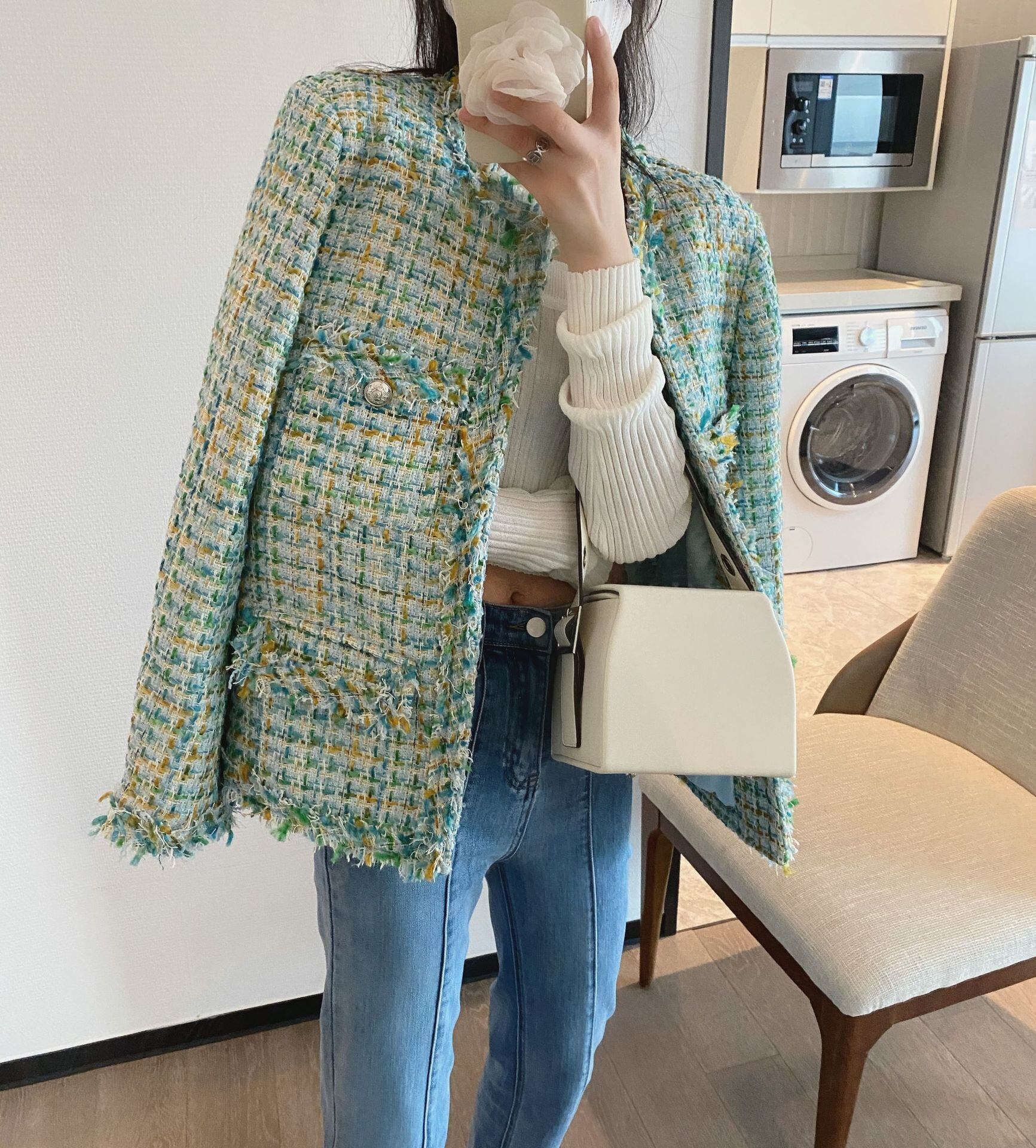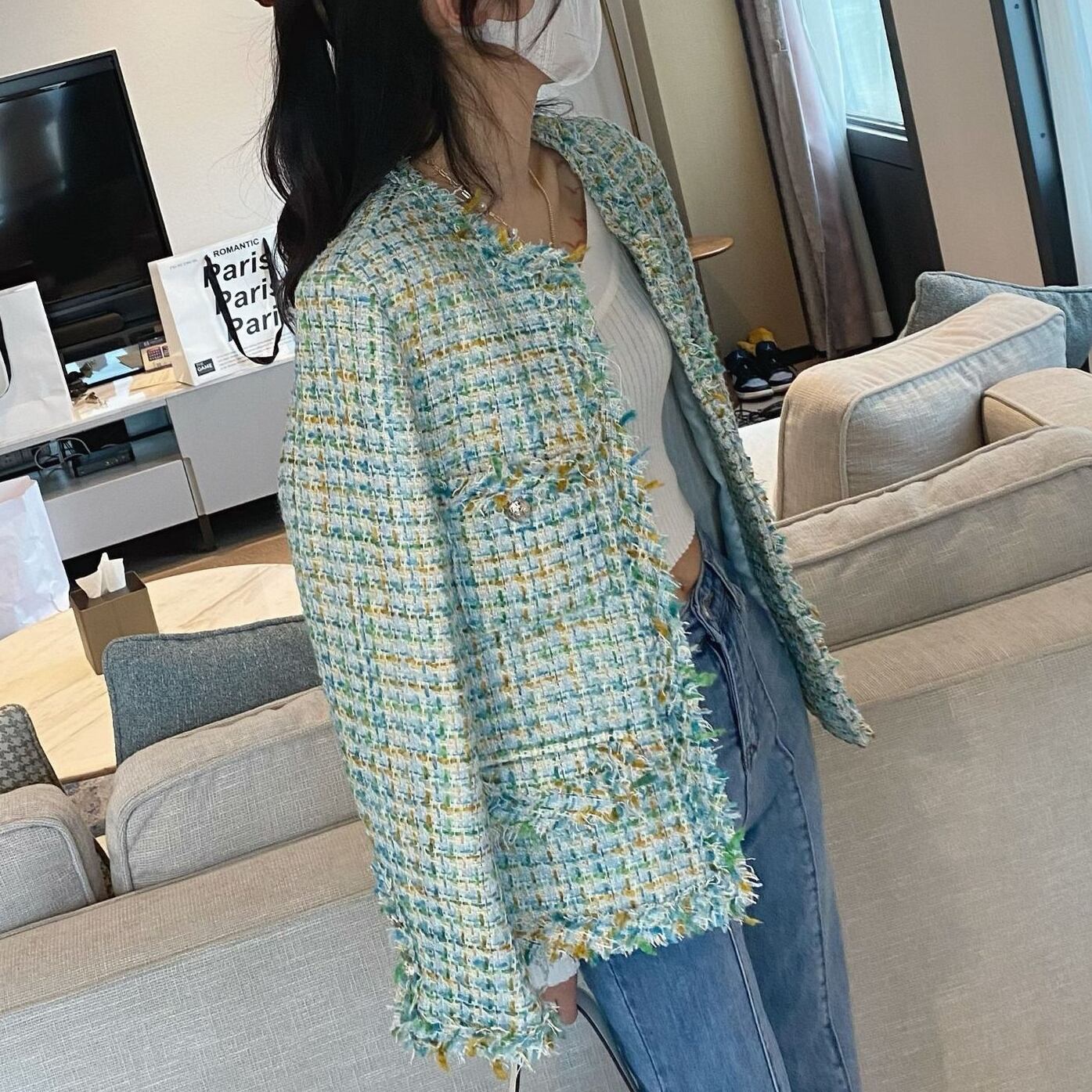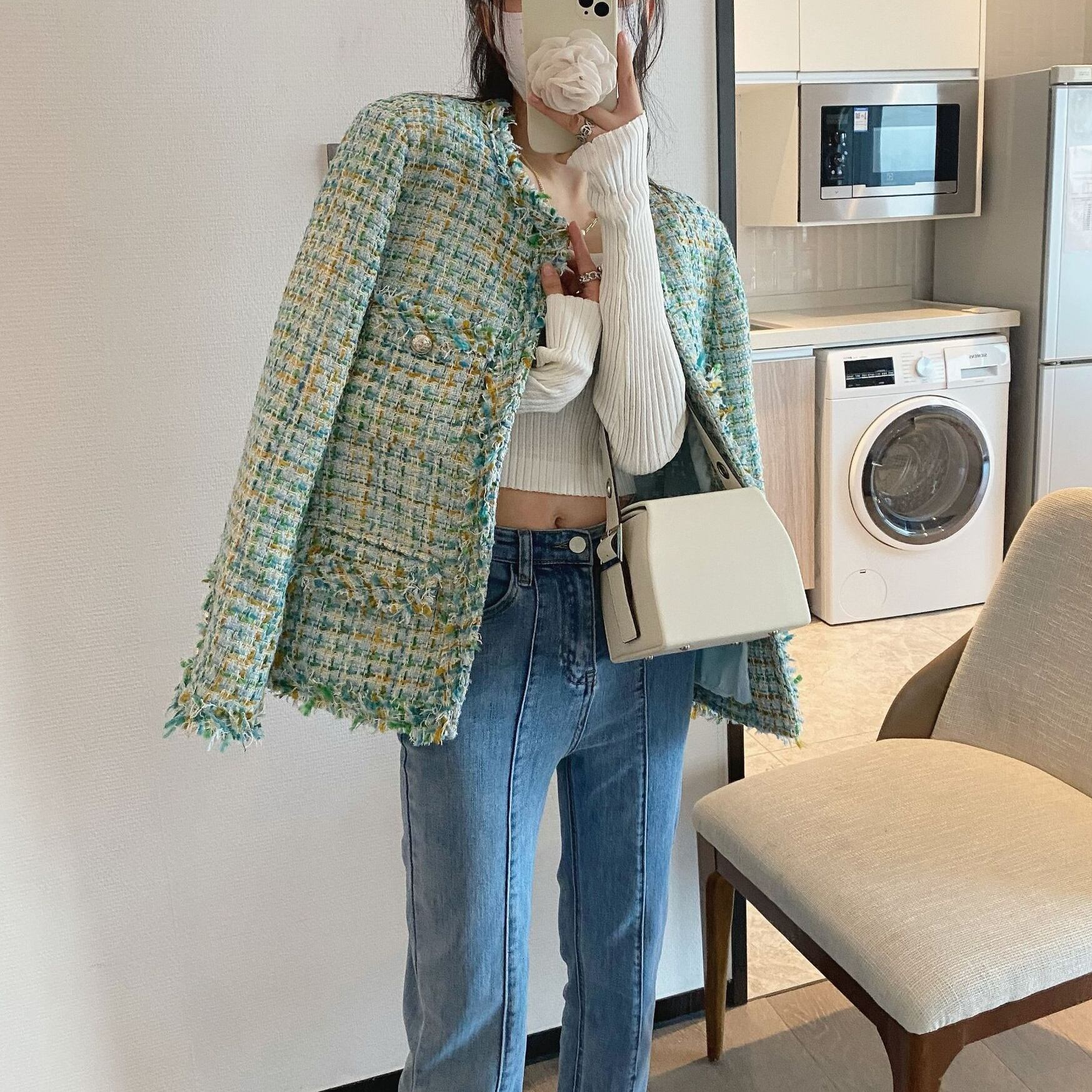 ジャケット レディース ノーカラージャケット チェック フリンジ カラフル ツイード メタルボタン クルーネック ショート丈 パフスリーブ バイカラー アウター ミディアム丈 オーバーサイズ 韓国風 軽い 軽量 フード付き 冬服 厚手 アウター 暖かい 大きいサイズ スリム 防寒 10代 20代 30代 40代 レディース オフィス OL 通勤 学生 通学 デート お出かけ 女子会 リゾート 旅行 着回し 普段使い 韓国系 ファッション コーデ スタイル モテ 体型カバー ブルー アプリコット