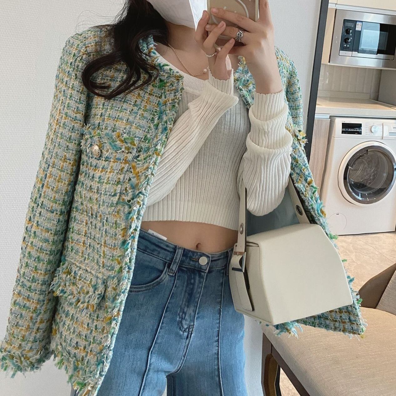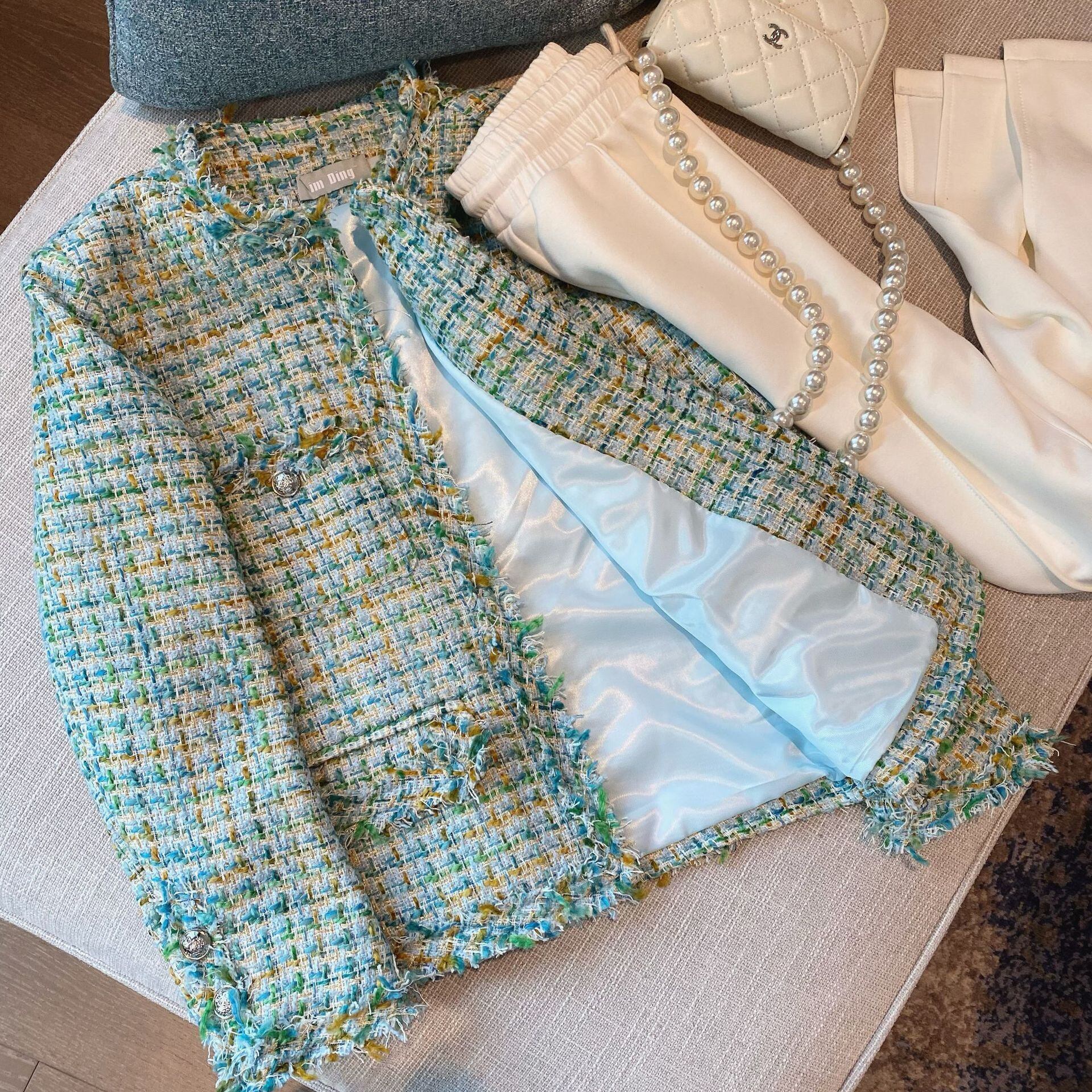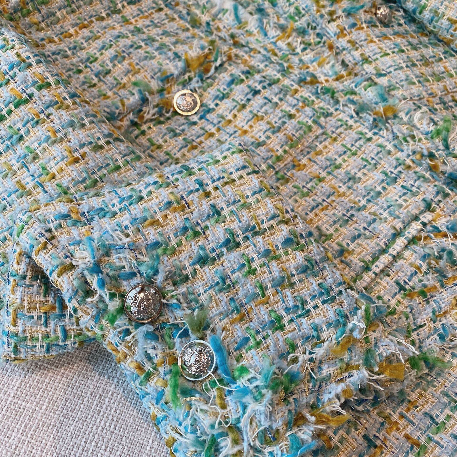 ジャケット レディース ノーカラージャケット チェック フリンジ カラフル ツイード メタルボタン クルーネック ショート丈 パフスリーブ バイカラー アウター ミディアム丈 オーバーサイズ 韓国風 軽い 軽量 フード付き 冬服 厚手 アウター 暖かい 大きいサイズ スリム 防寒 10代 20代 30代 40代 レディース オフィス OL 通勤 学生 通学 デート お出かけ 女子会 リゾート 旅行 着回し 普段使い 韓国系 ファッション コーデ スタイル モテ 体型カバー ブルー アプリコット