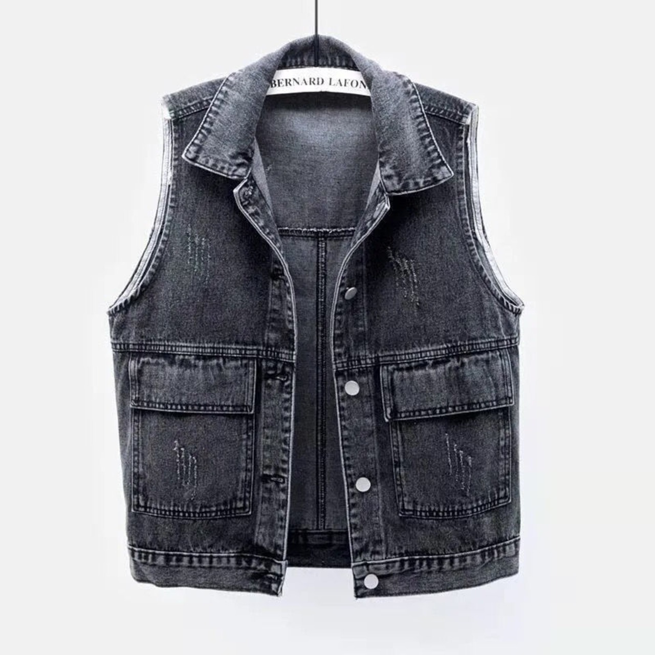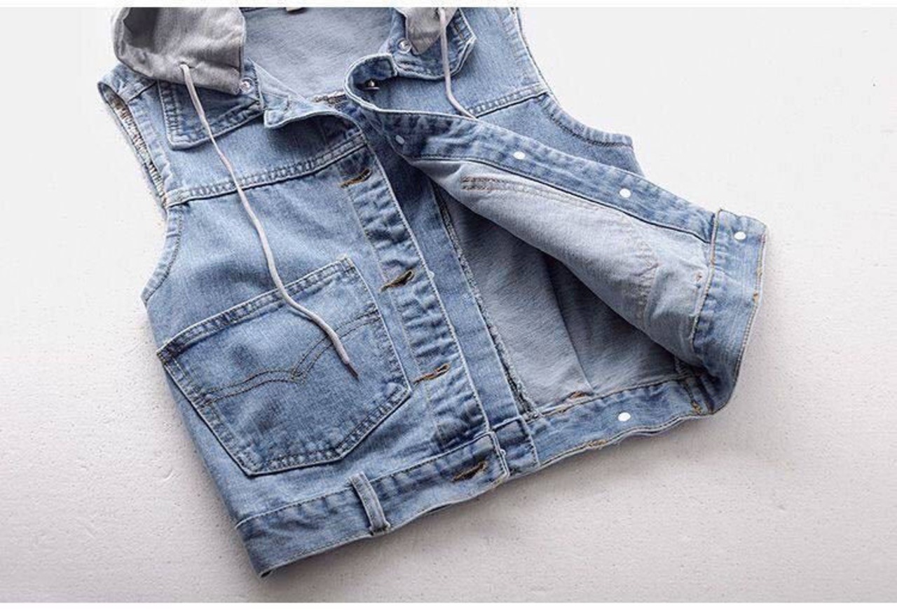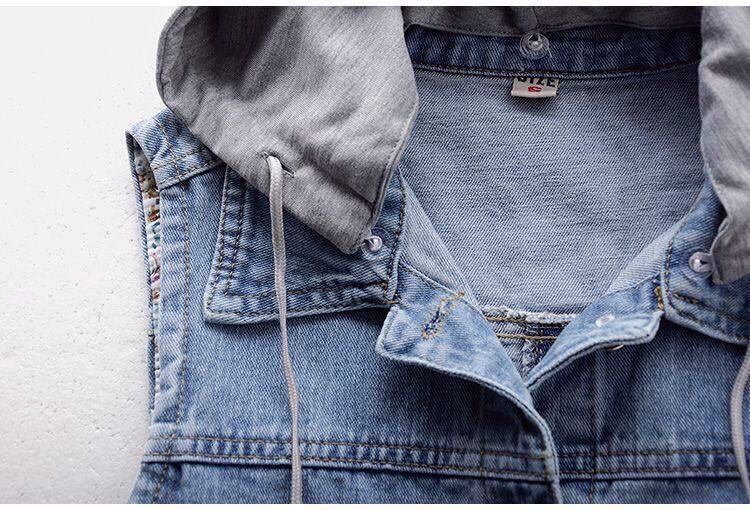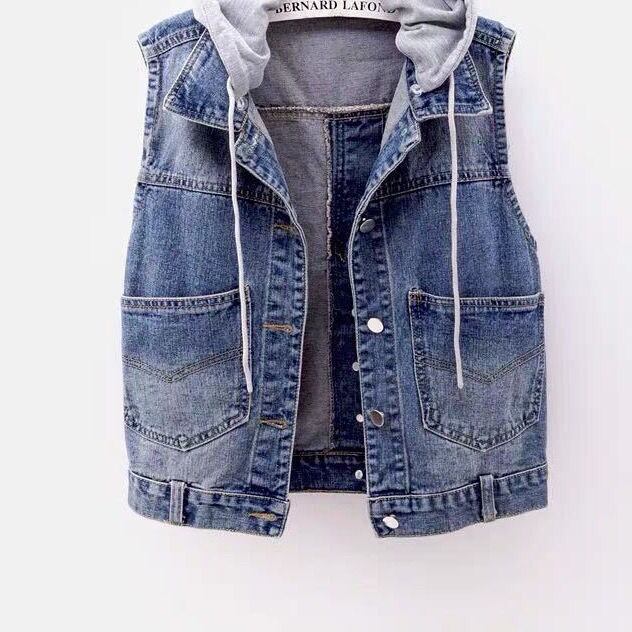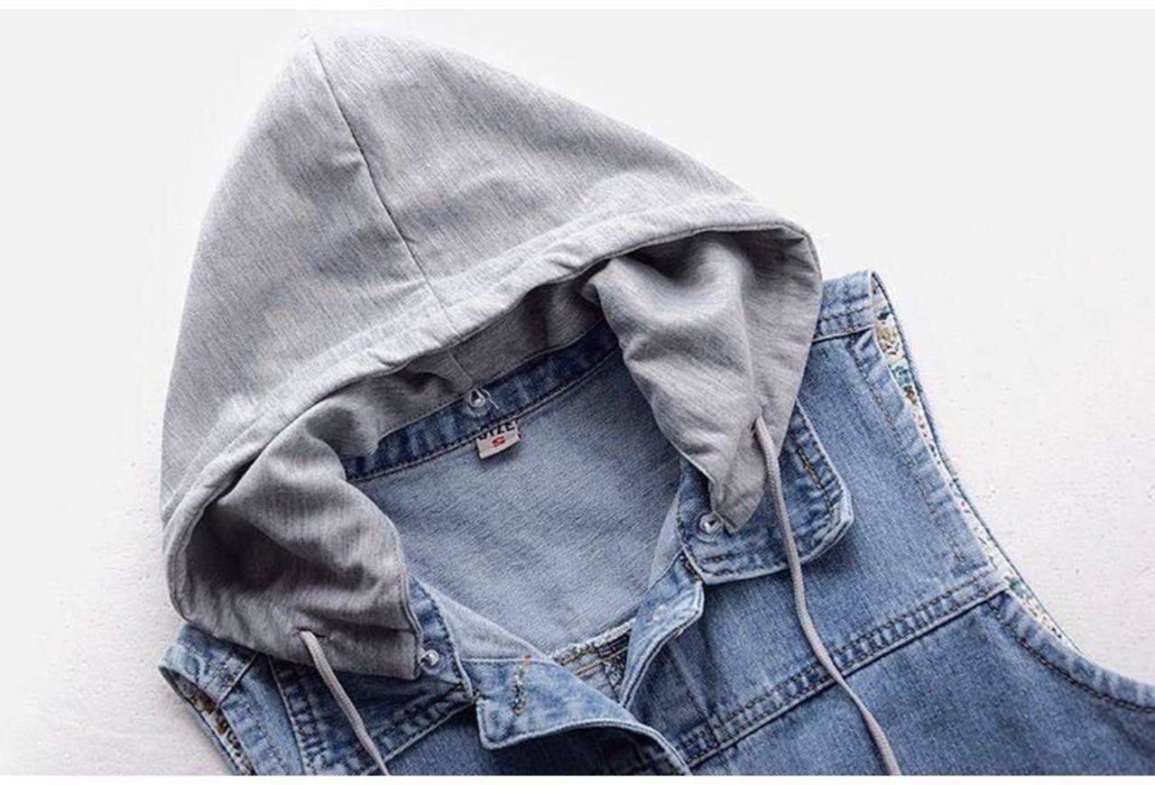 スウェット生地のフード付きデニムベストです。