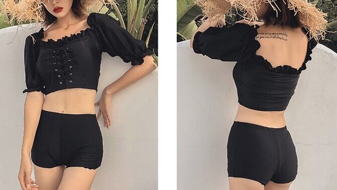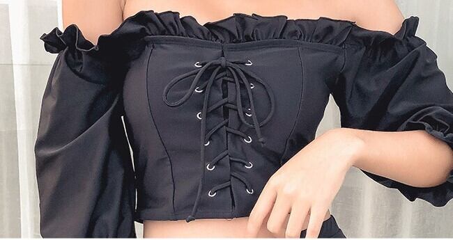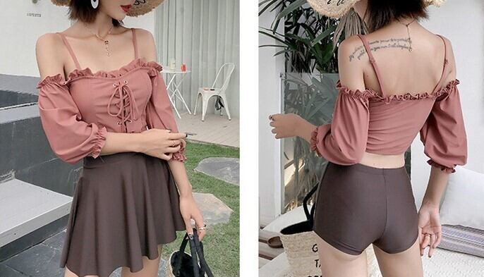 水着 ビキニ スイムウェア レディース セパレート オフショルダー パッド付き 紐 二の腕カバー シャーリング 3点セット 大人可愛い セクシー カジュアル 華やか おしゃれ 主役級 存在感 10代 20代 30代 スタイルアップ 韓国 M L XL 黒 ブラック ベージュ ボルドー