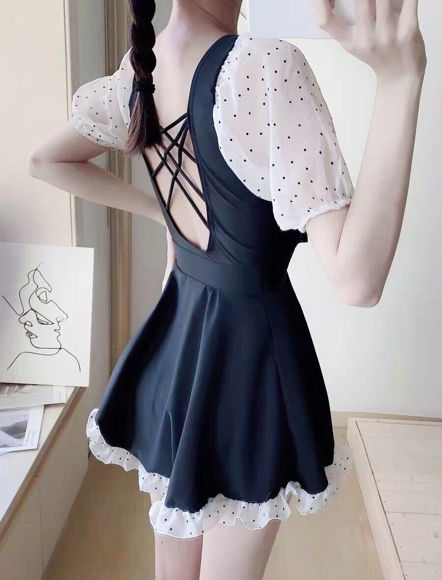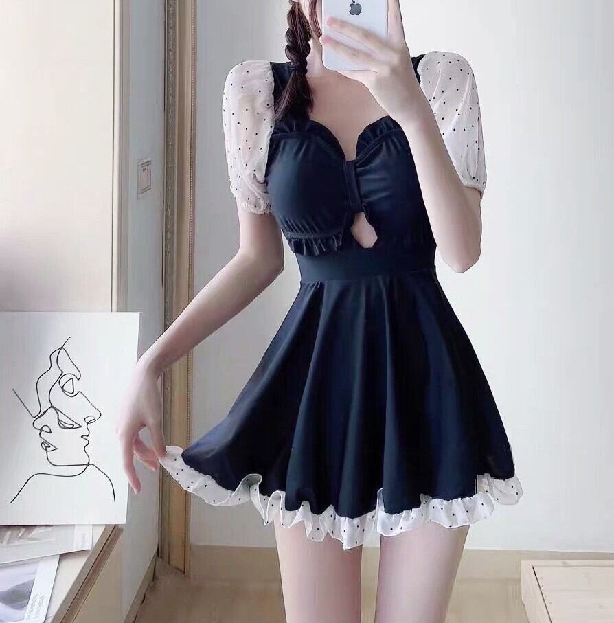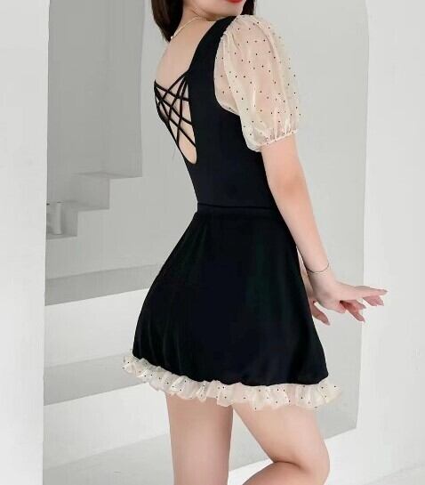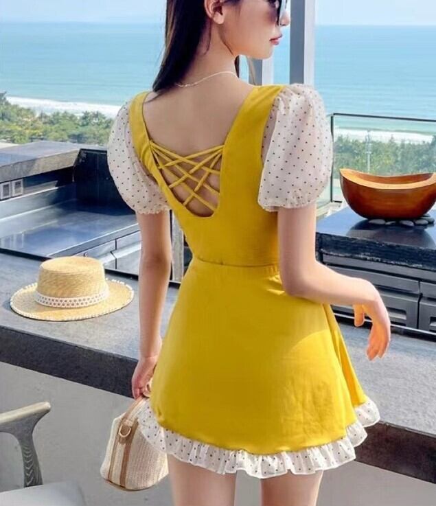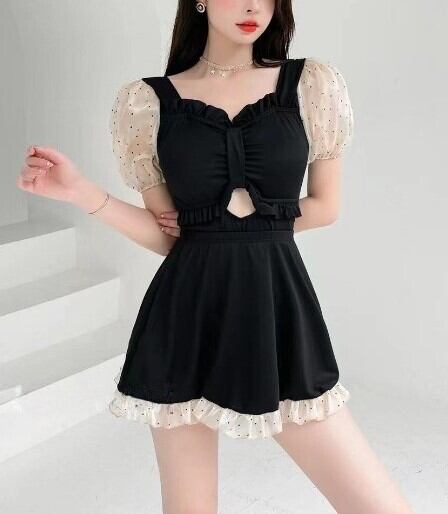 水着 スイムウェア レディース ワンピース パッド付き スカート付き リボン チュール フリル ハイウエスト 2点セット 大人可愛い カジュアル 華やか おしゃれ お洒落 レトロ 存在感 ラブリー キュート ガーリー 10代 20代 海 ビーチ プール リゾート 中学生 高校生 体系カバー 二の腕カバー 安い 流行 インスタ映え M L XL ブラック イエロー