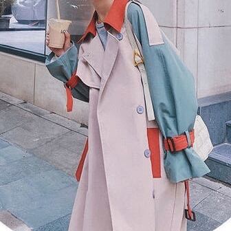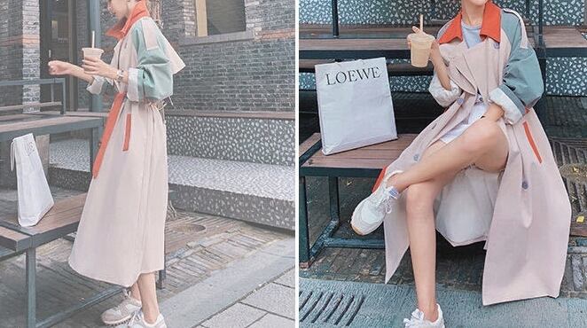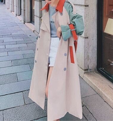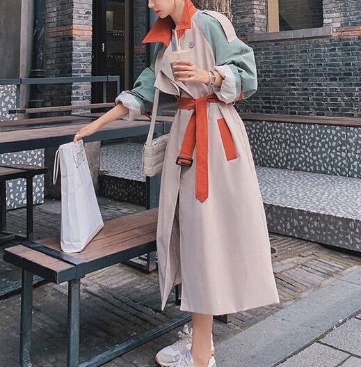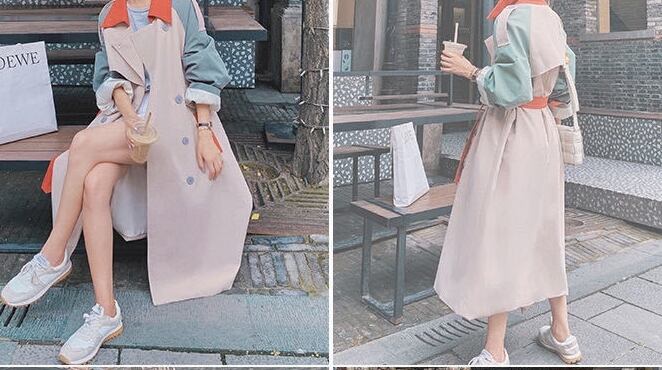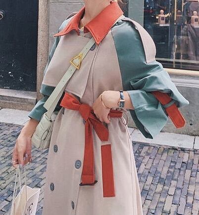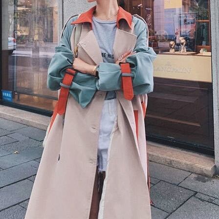 マルチカラ―切り替えが個性的で華やかなトレンコートです。