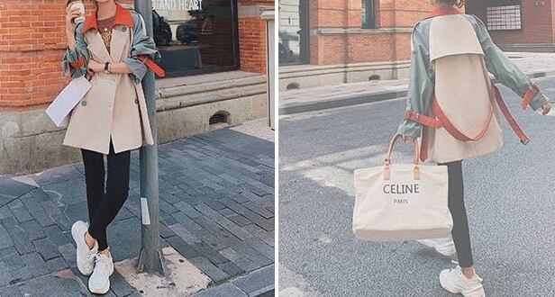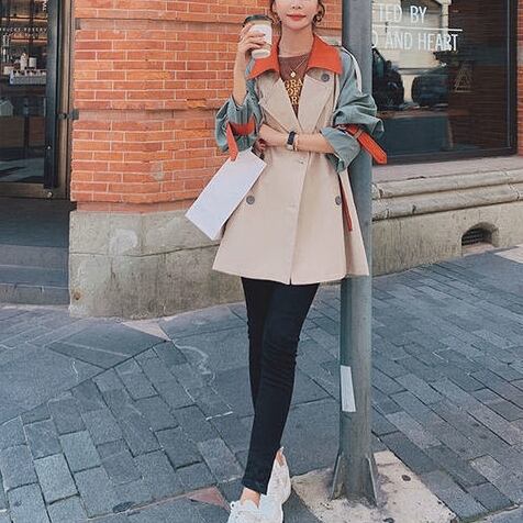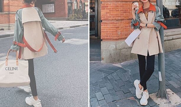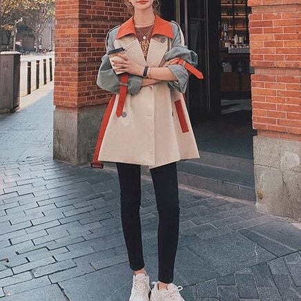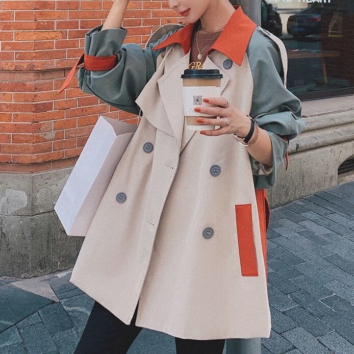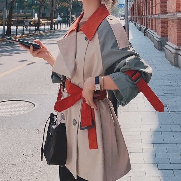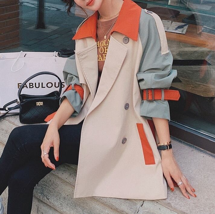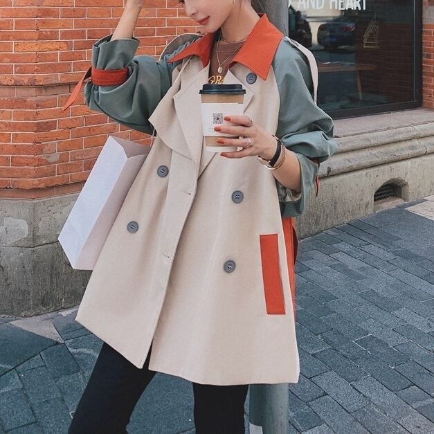 マルチカラ―切り替えが個性的で華やかなトレンコートです。