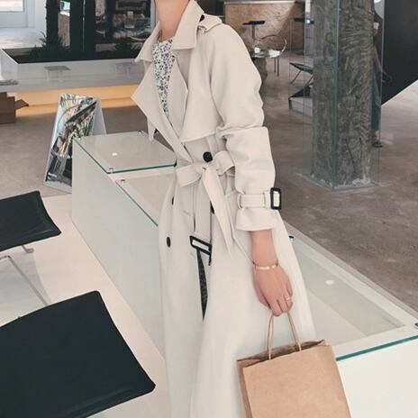 きちんと感のあるスクエアバックル付きベルトが上品な定番のトレンコートです。