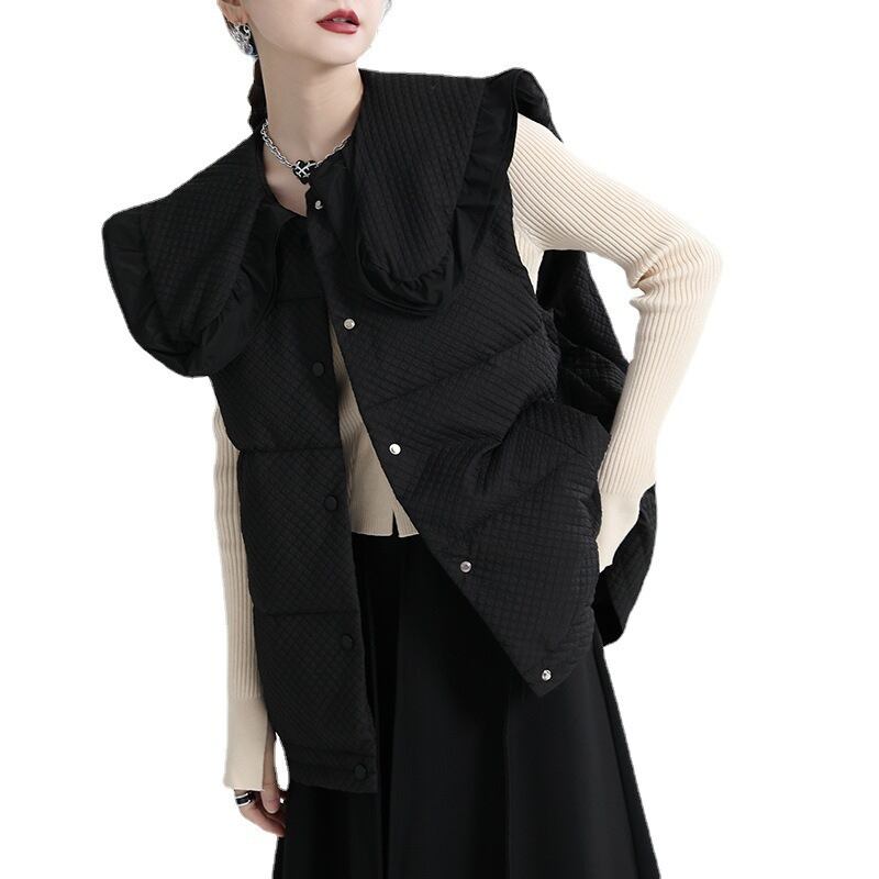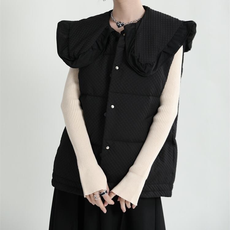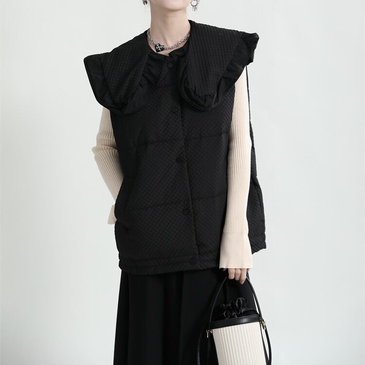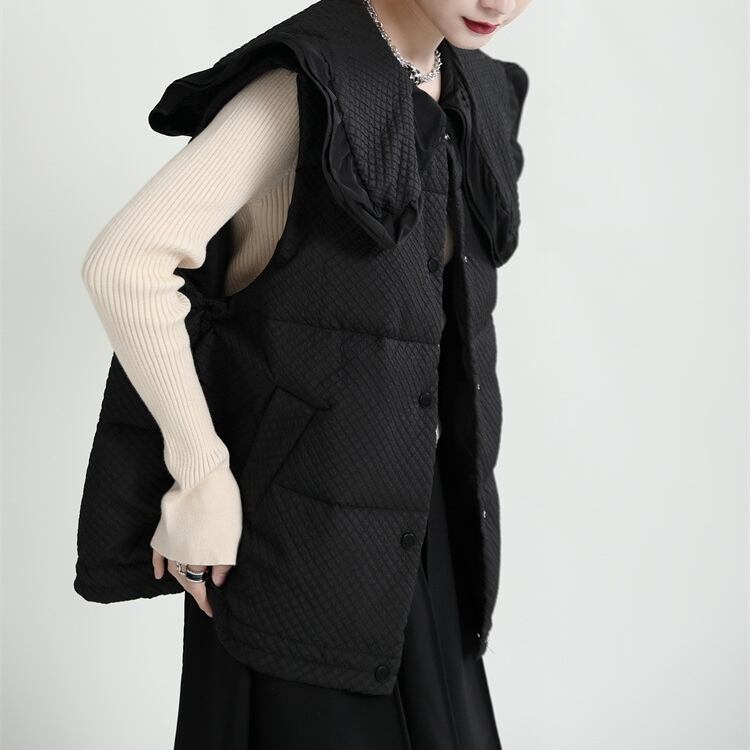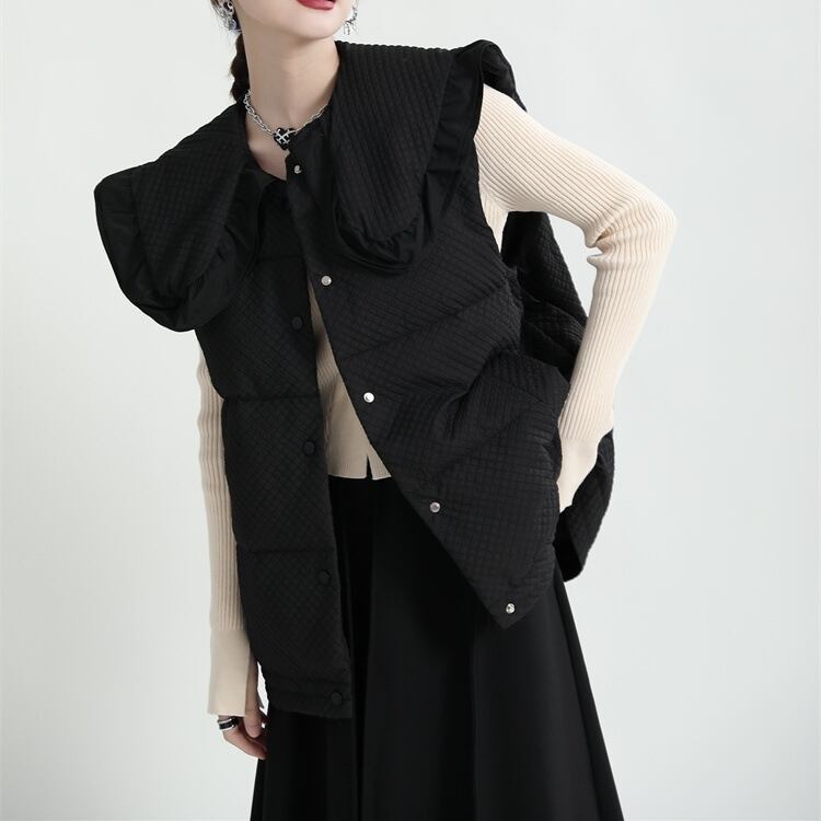 中綿ベスト レディース アウター ダウンコート キルティング ショート丈 襟付き ラージカラー フリル ワッフル 韓国風 中綿ダウンコート 軽い 軽量 フード付き 冬服 アウター 暖かい 大きいサイズ スリム 防寒 10代 20代 30代 40代 レディース オフィス OL 通勤 学生 通学 デート お出かけ 女子会 リゾート 旅行 着回し 普段使い 韓国系 オルチャン ファッション コーデ スタイル モテ 体型カバー ワンサイズ アプリコット ブラック