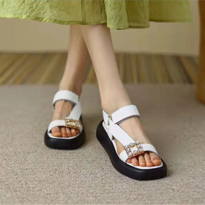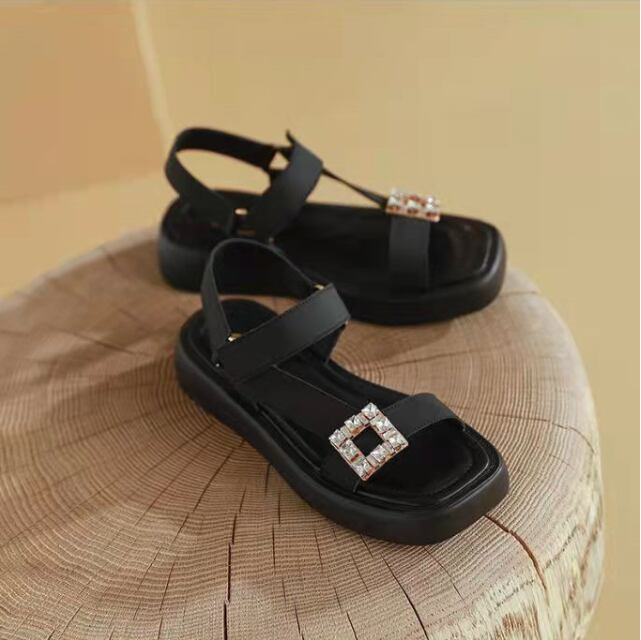 スクエア型のビジューがシンプルなサンダルのアクセントになり女性っぽさをプラス。