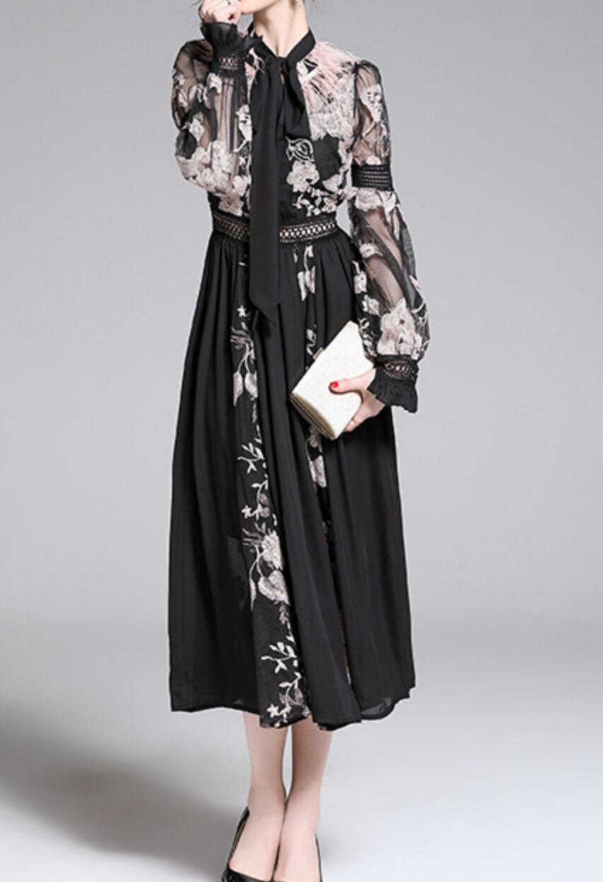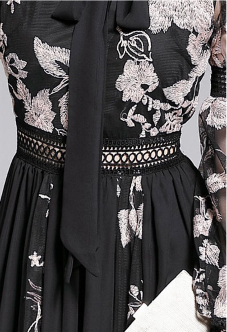 エレガントなフローラル刺繍のロングパーティードレス。