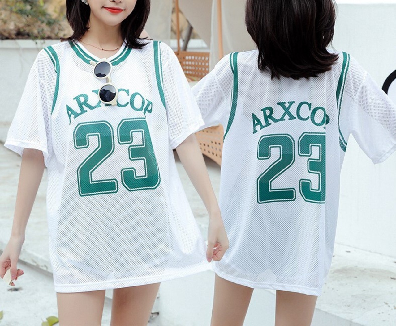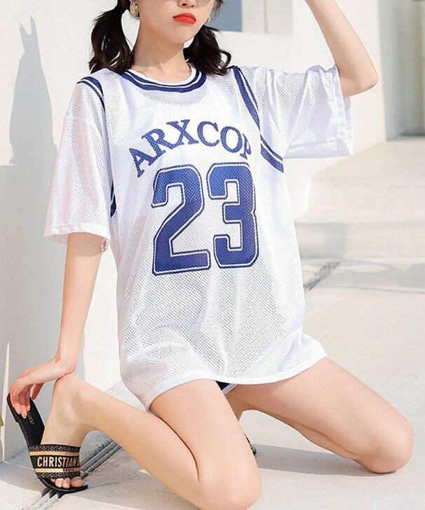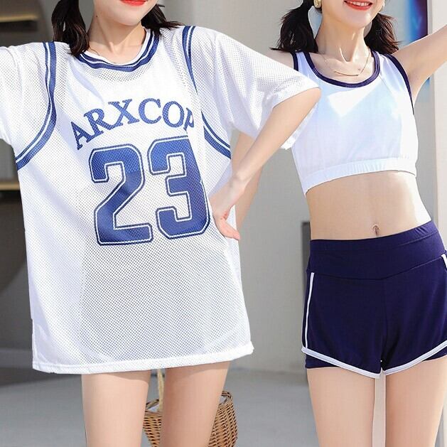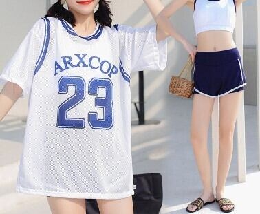 メッシュ素材のビッグTシャツが付いた水着3点セットです。