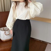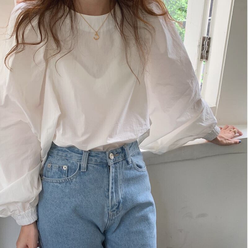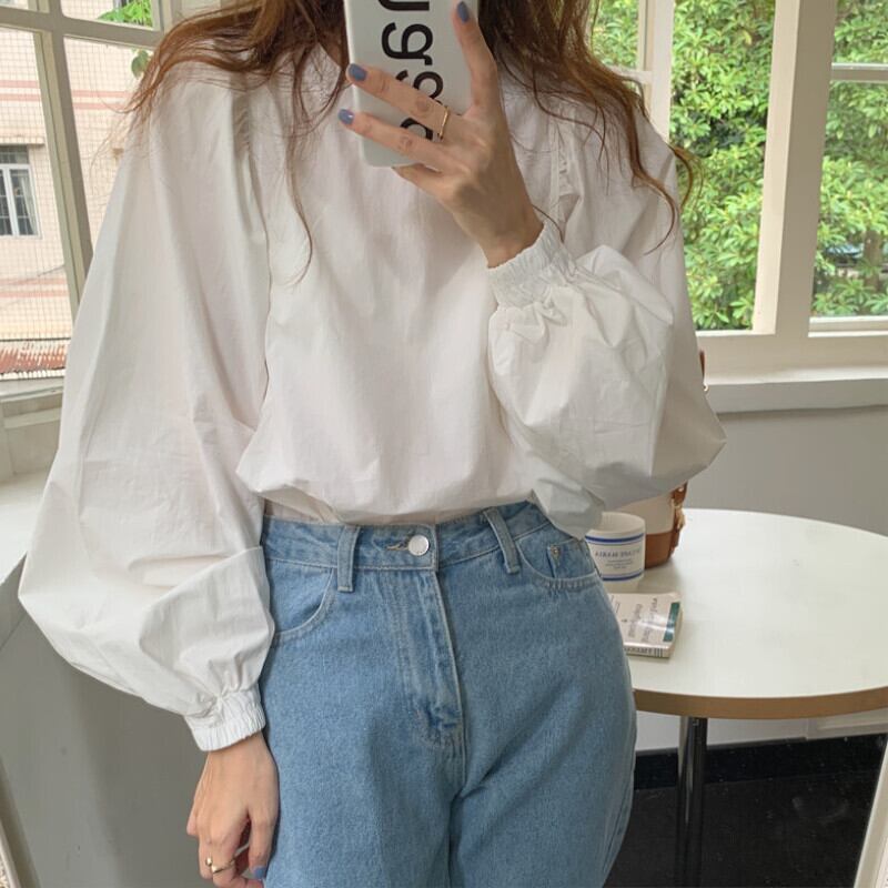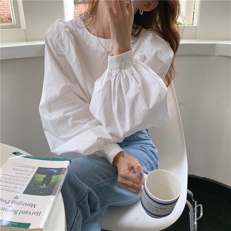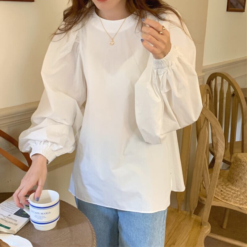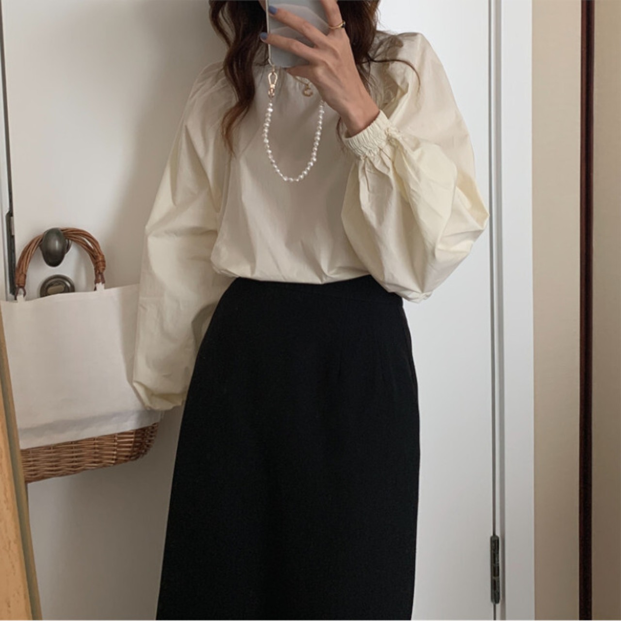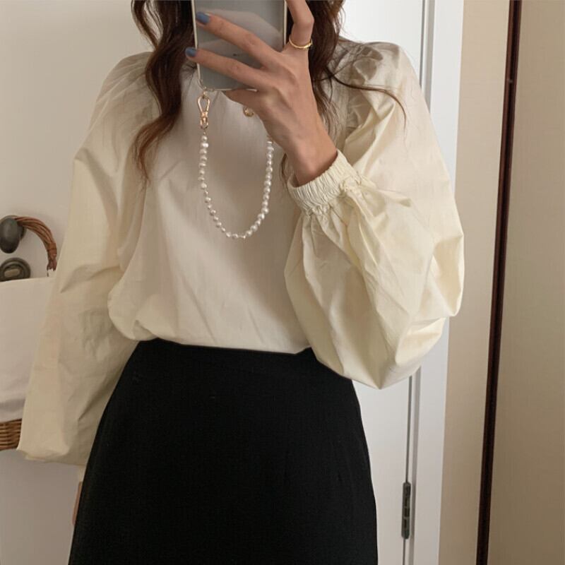 トップス ブラウス 袖あり 長袖 ランタンスリーブ Vネック クルーネック きれいめ 上品 おしゃれ レトロ こなれ感 エレガント 無地 春 秋 10代 20代 30代 40代 レディース オフィス OL 通勤 デート お出かけ 女子会 休日 着回し 普段使い 韓国系 オルチャン ファッション コーデ スタイル 暖かい モテ 体型カバー ワンサイズ 白 ホワイト ベージュ