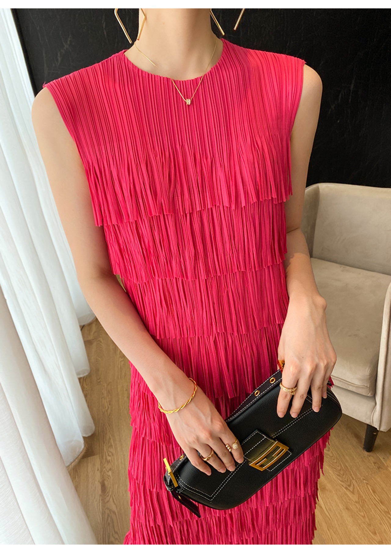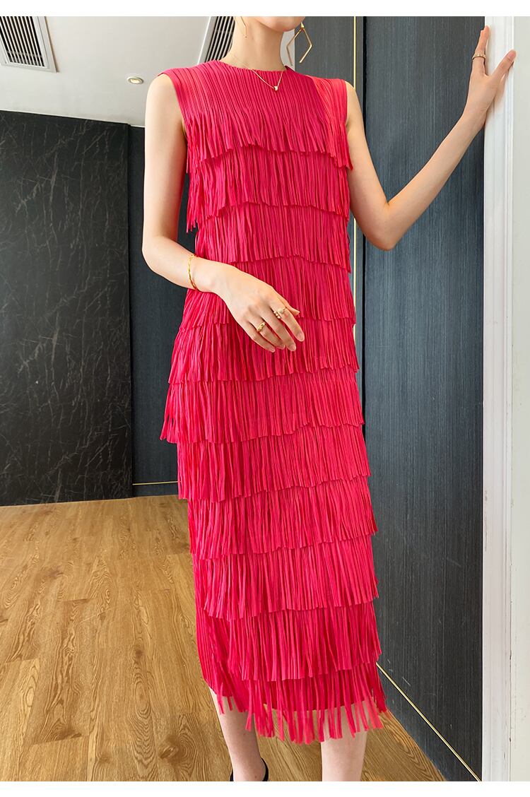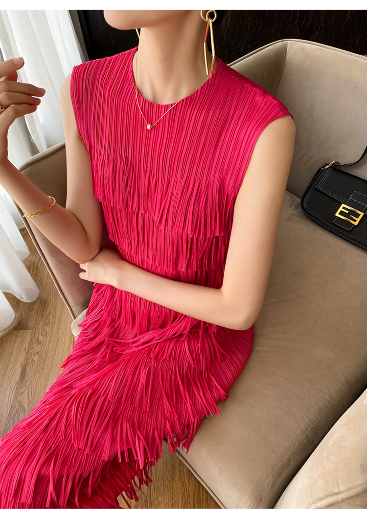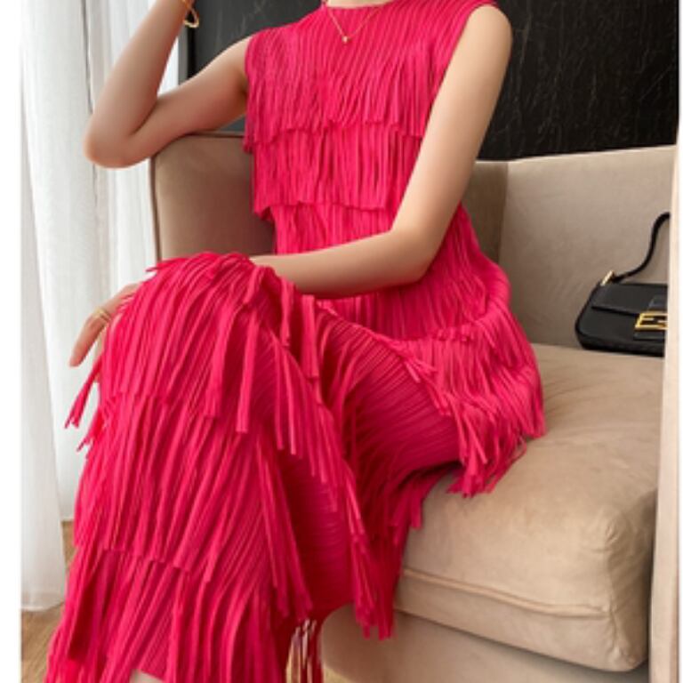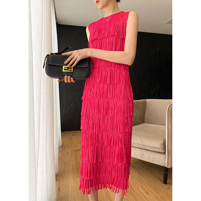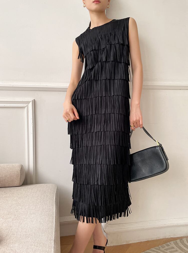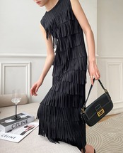 ゆらゆら揺れるフリンジのロングパーティードレス。