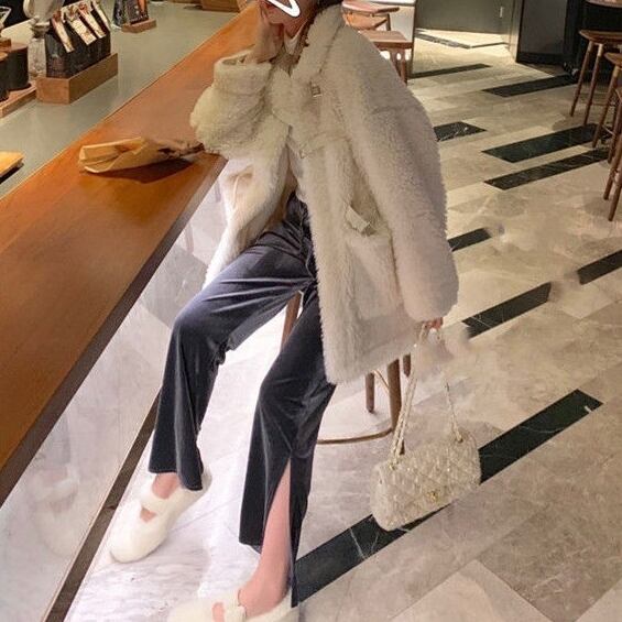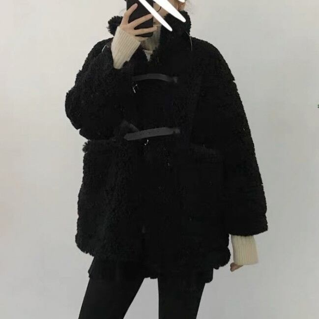 ボアとレザーベルトの調和が可愛いハイネックジャケットです。