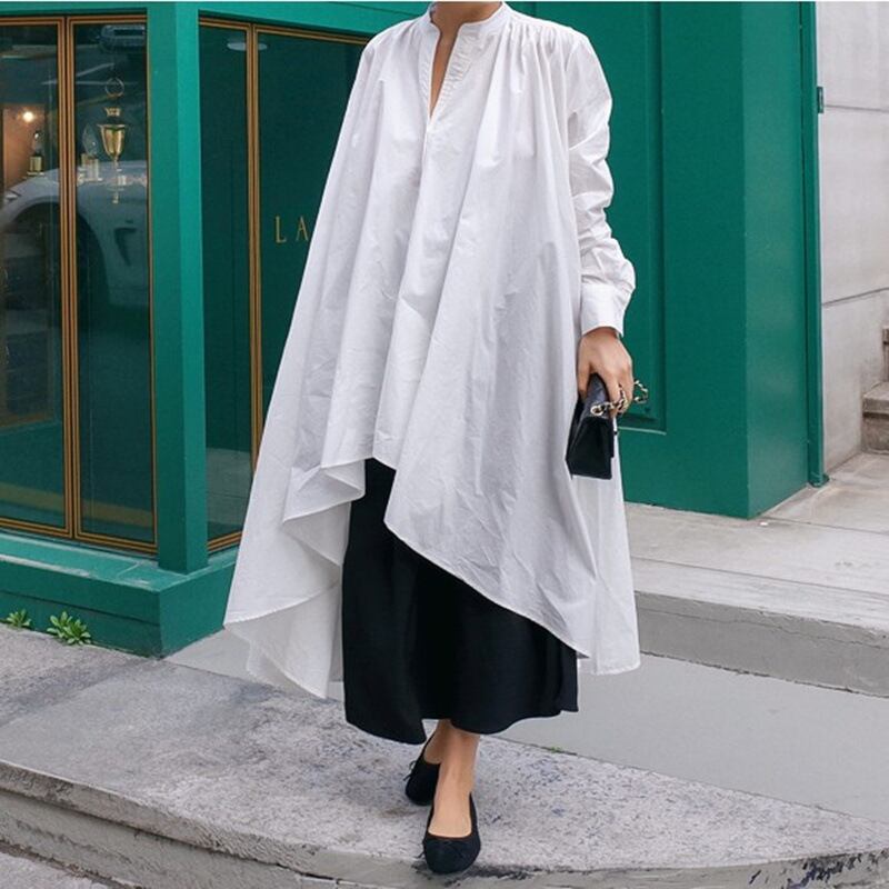 トップス ワンピース シャツ ロング ロング丈 袖あり 長袖 襟なし フレア ワイド 綿 きれいめ シンプル カジュアル 大人 上品 おしゃれ かっこいい レトロ こなれ感 ラフ 個性的 クール モード系 無地 春 秋 20代 30代 40代 レディース ビジネス OL 通勤 サイズ S M L XL ホワイト ブラック