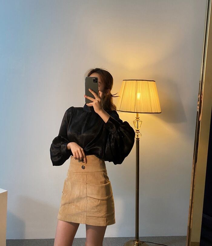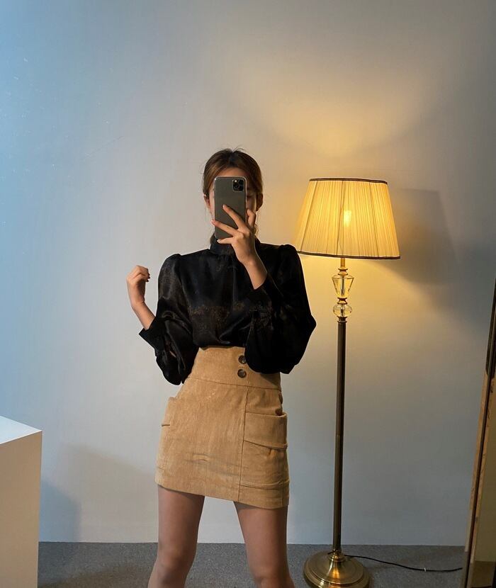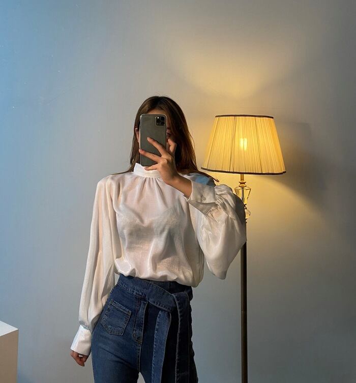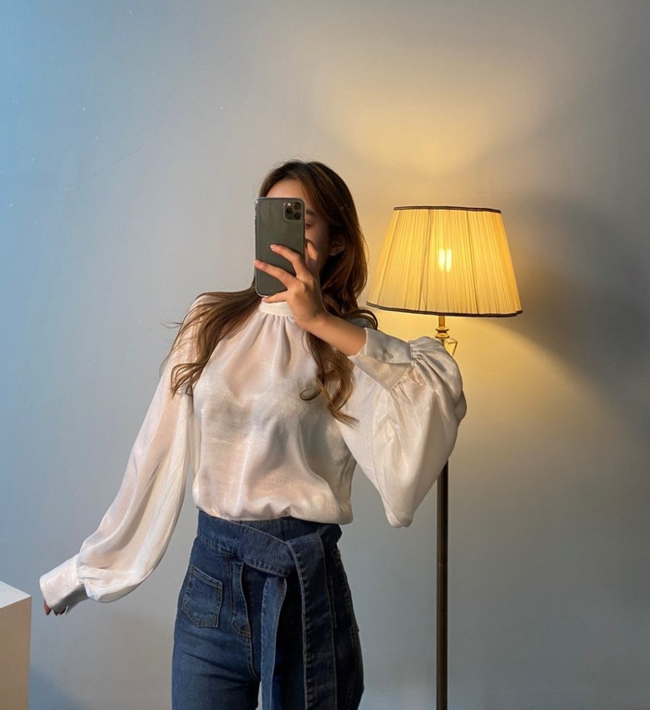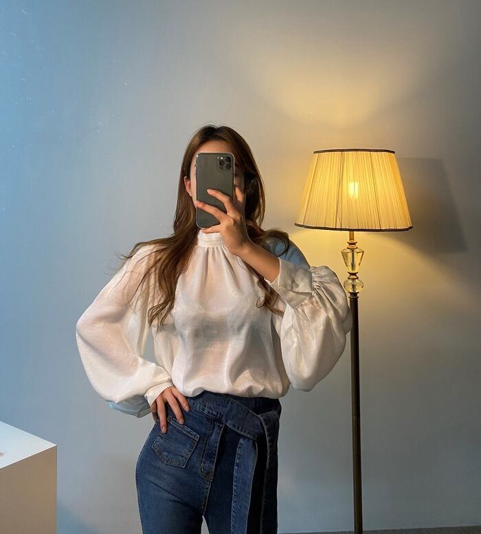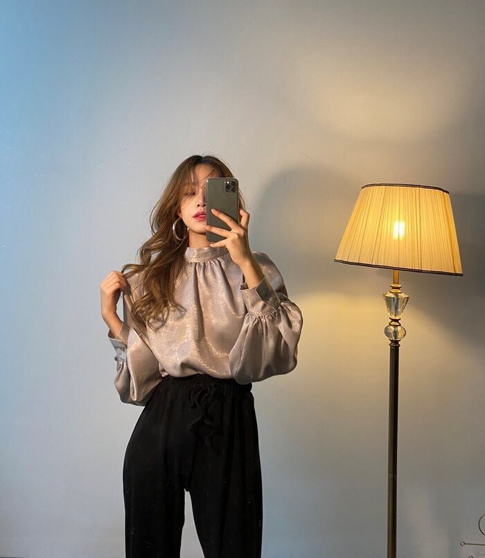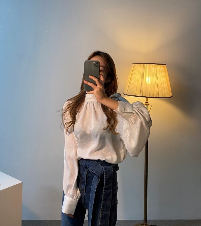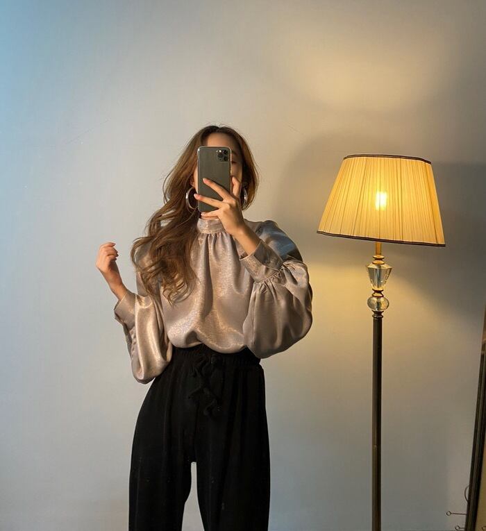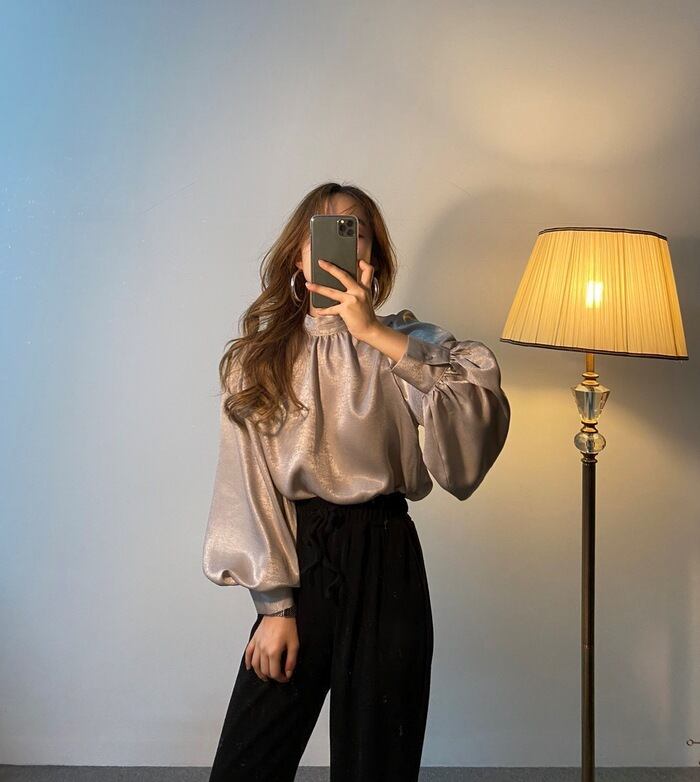 程よい光沢感とシブラウスはトレンドのボリュームスリーブがポイントになっています。