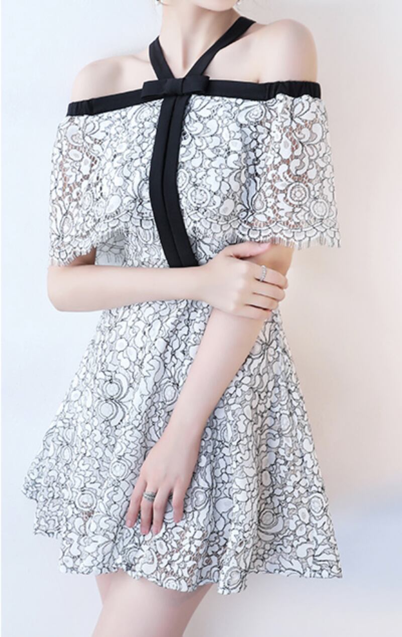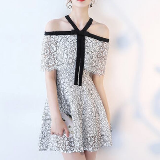 フローラルなレースのホルターネックミニパーティードレス。