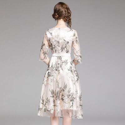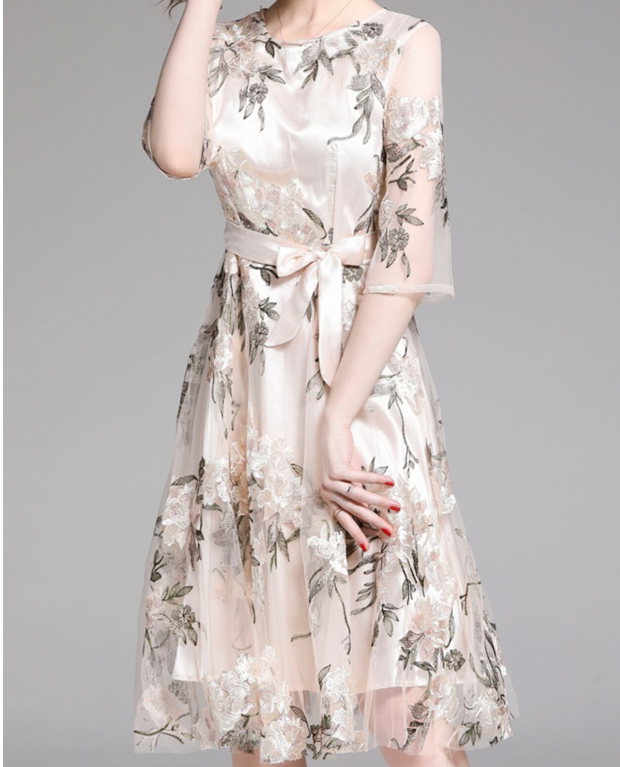 フローラル刺繍がエレガントなふんわりフレアパーティードレス。