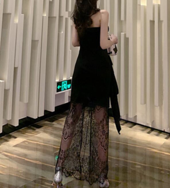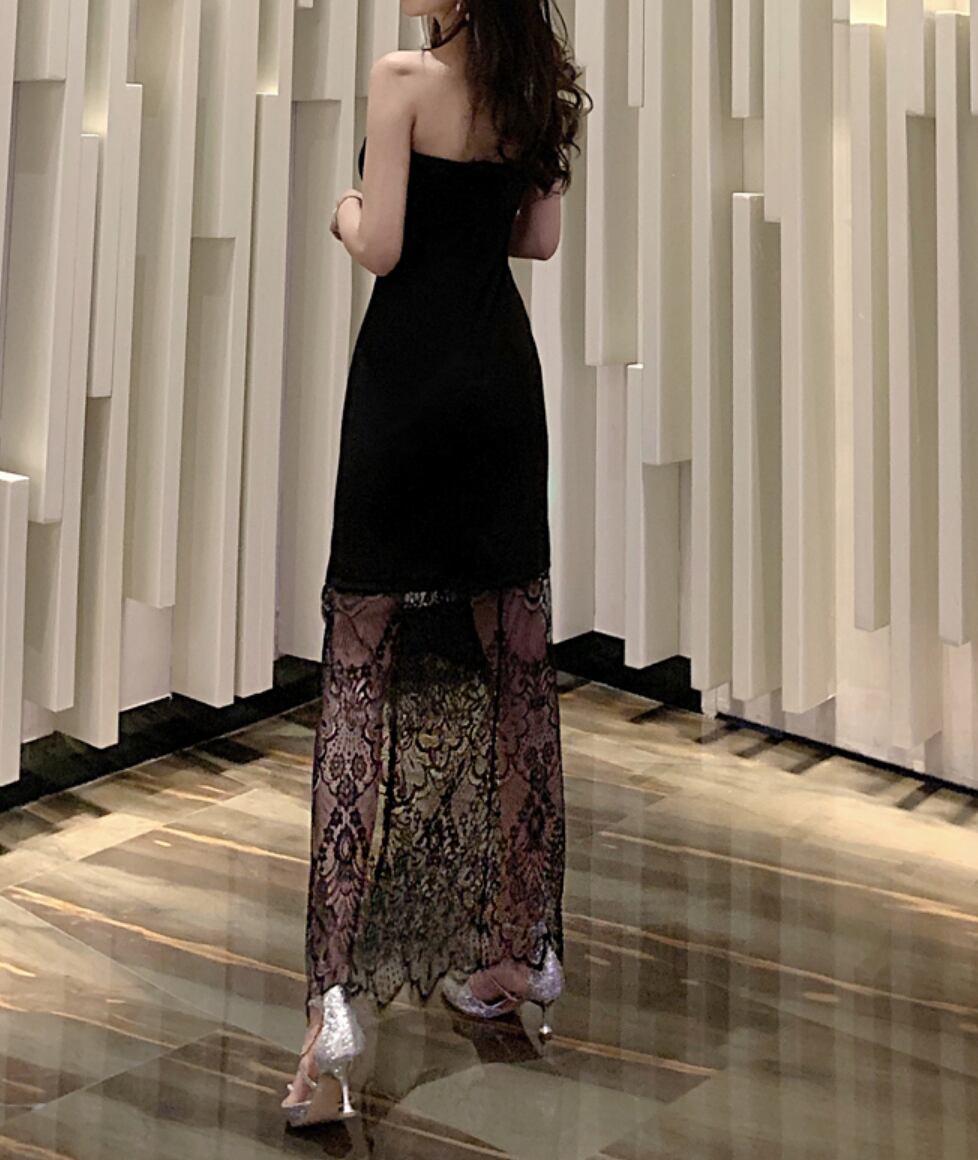 セクシーなスリットのロングレースチューブトップドレス。