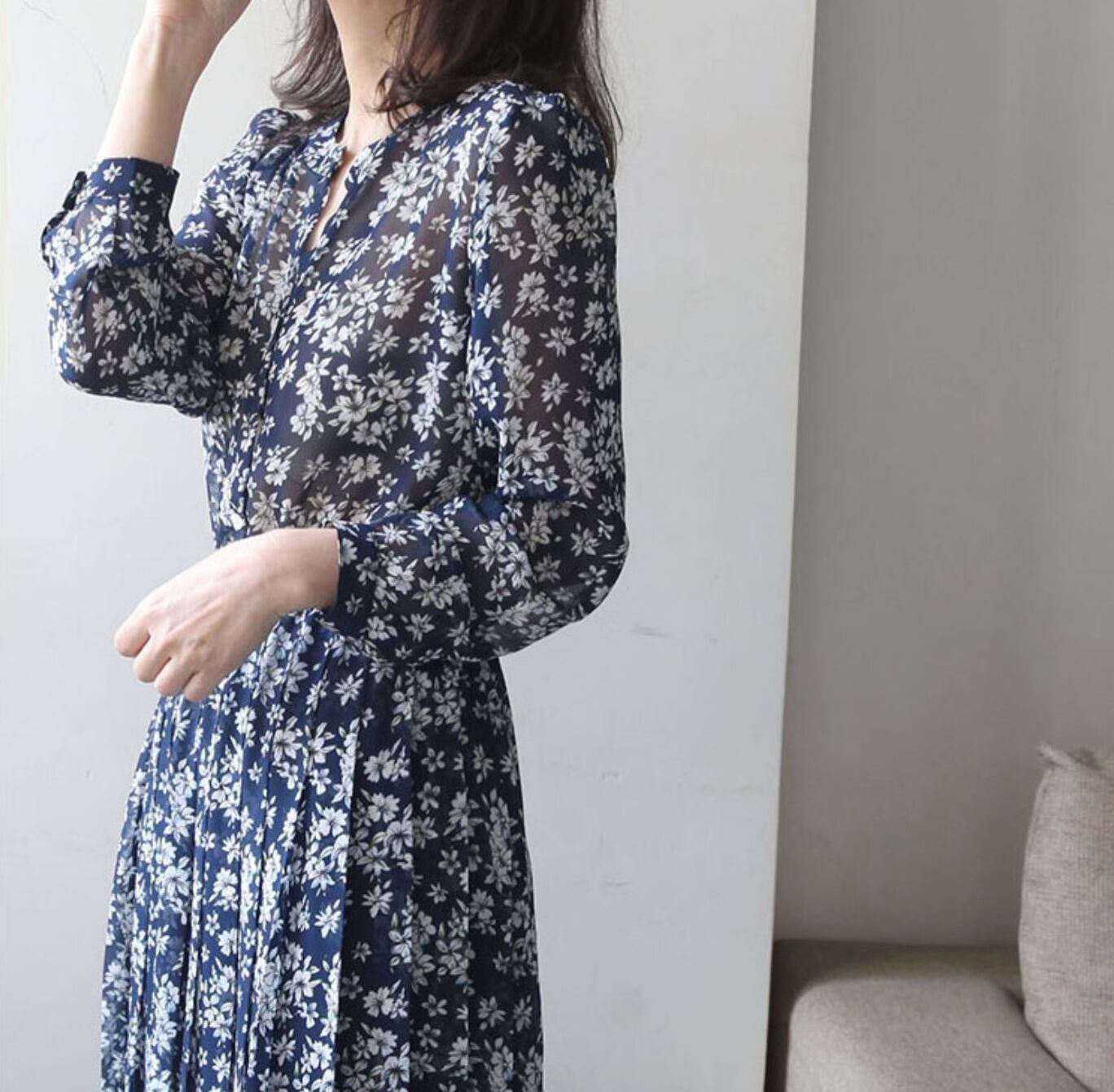 フラワープリントがお洒落なシフォンロングワンピース。