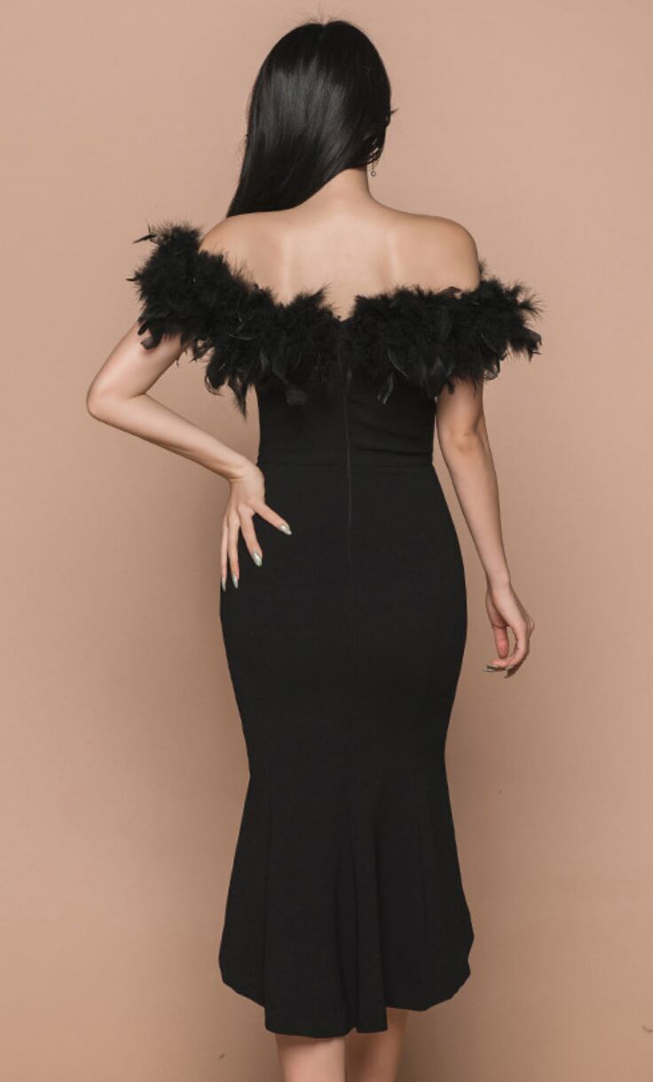 フェザーのボリュームオフショルダーロングパーティードレス。