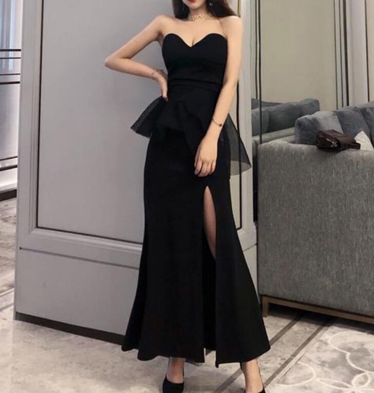 セクシーなベアトップのロングスリットフォーマルドレス。
