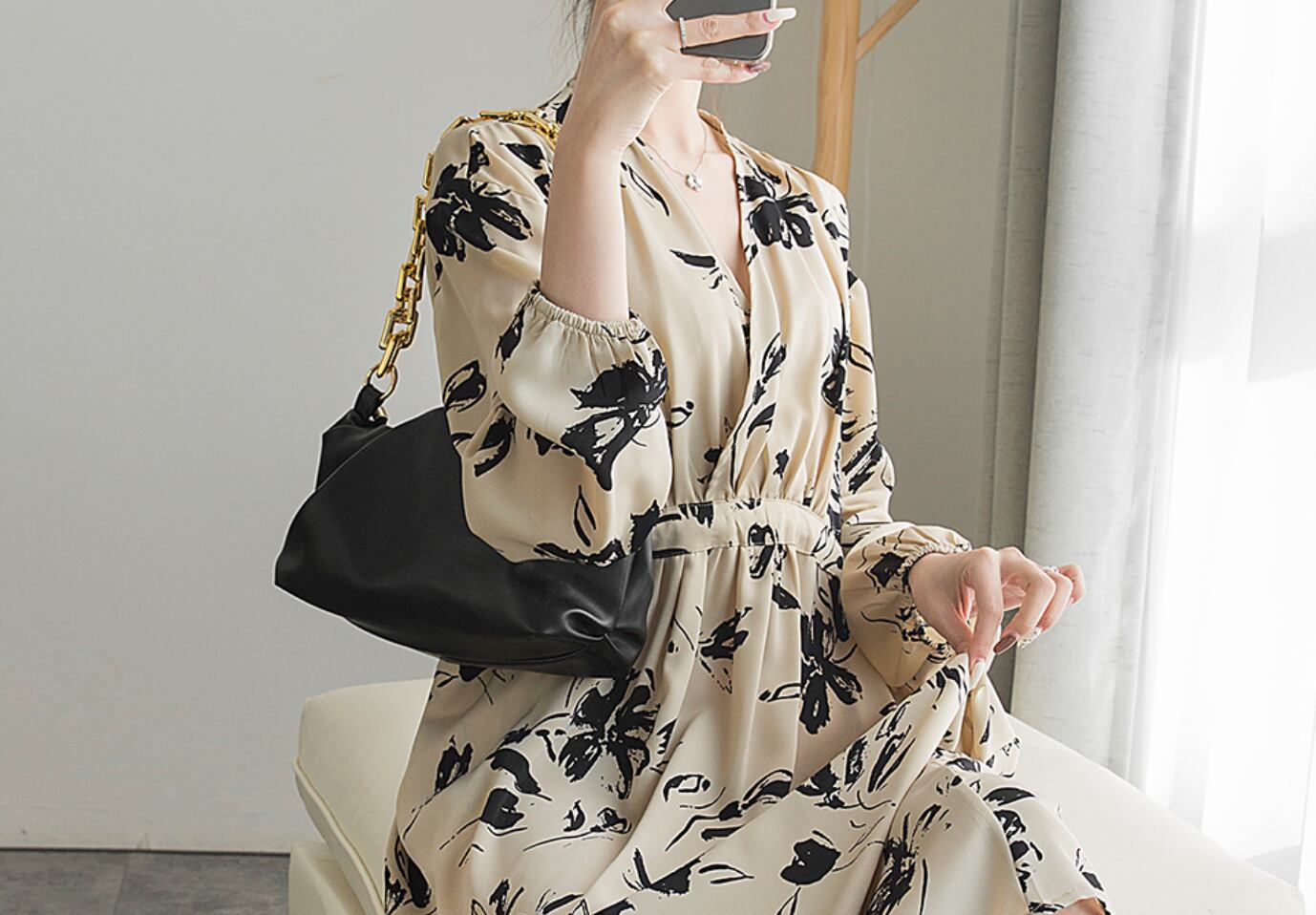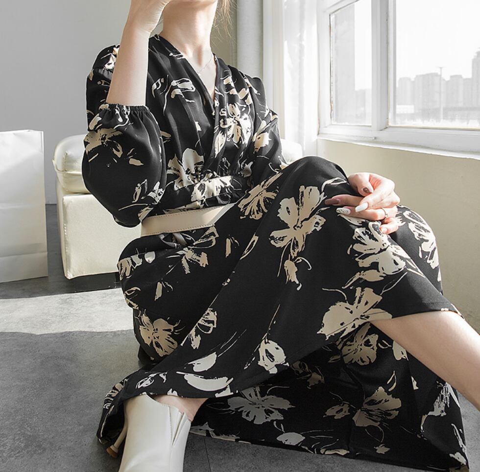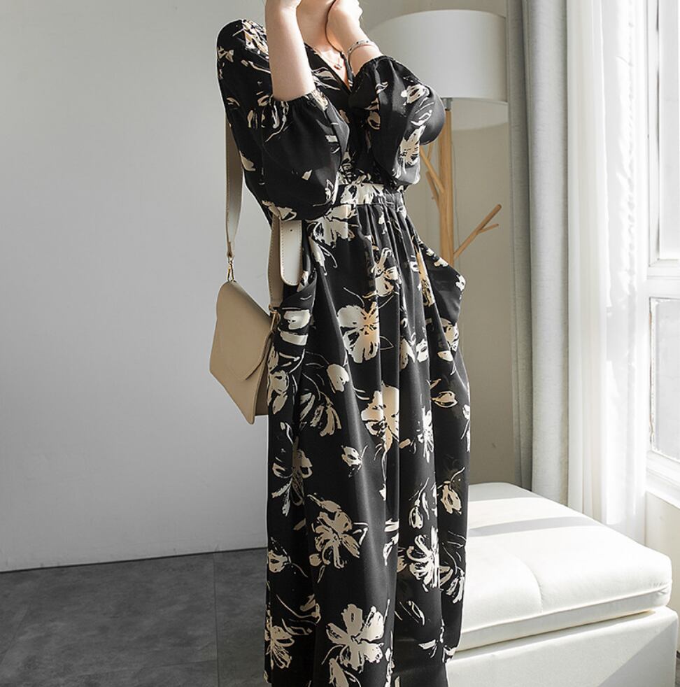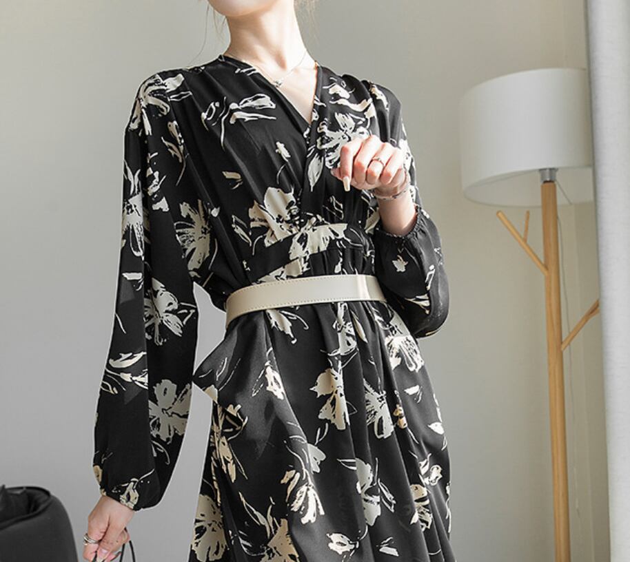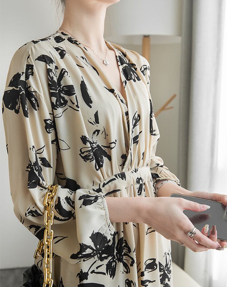 ドレス おすすめ おしゃれ お洒落 激安 安い 送料無料 プチプラ パーティードレス お呼ばれ ドレス フォーマル ドレス ロングドレス ラウンジ ドレス カジュアル ドレス シフォン ドレス ゲスト ドレス 長袖 Aライン Vネック 膝丈 ボリュームスリーブ ふんわり 花柄 韓国 フォーマル 綺麗め 大人上品 シック 同窓会 卒業式 20代 30代 S M L 黒 ブラック 茶色 ブラウン ベージュ オフホワイト くすみカラー 大人カラー 春カラー