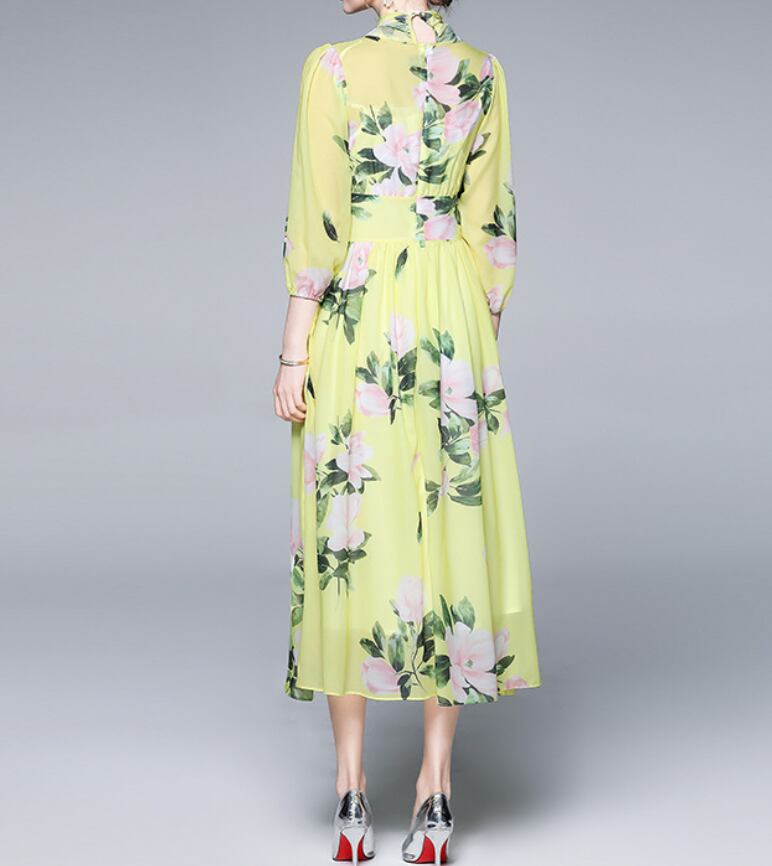 フラワープリントのエレガントなロングフォーマルワンピース。