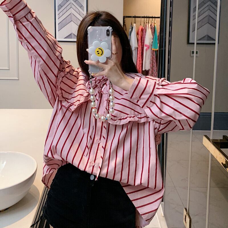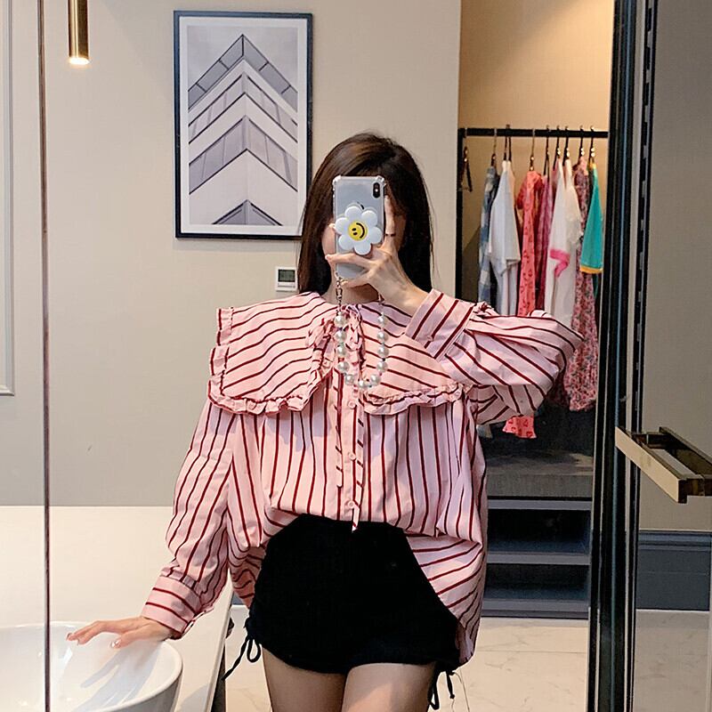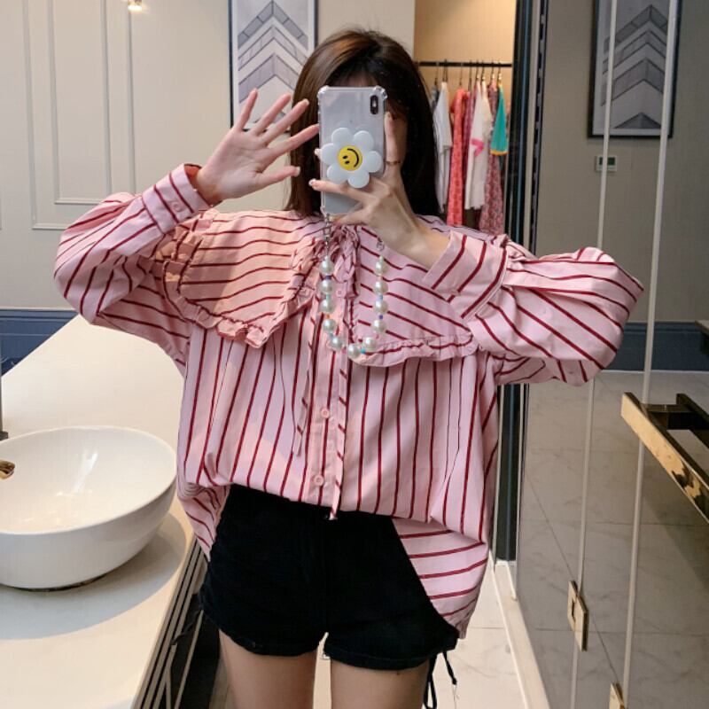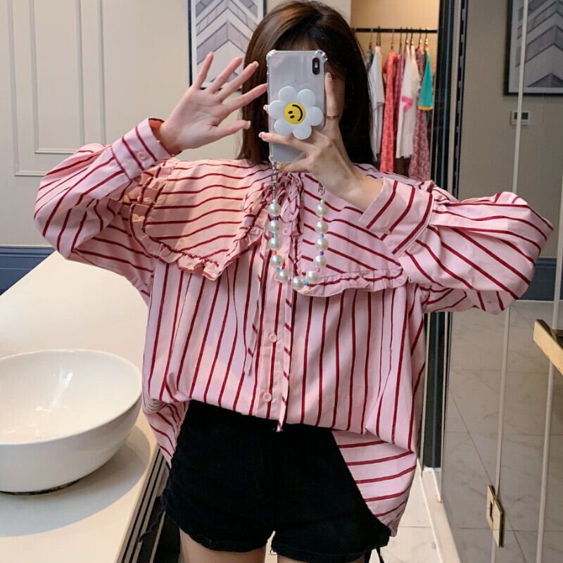 トップス シャツ 袖あり 長袖 襟付き ビッグカラー かわいい 大人可愛い きれいめ シンプル カジュアル 大人 おしゃれ レトロ こなれ感 ラフ キュート ストライプ 0 春 秋 10代 20代 30代 デート お出かけ 女子会 休日 韓国 オルチャン ファッション コーデ スタイル トレンド ワンサイズ 赤 レッド