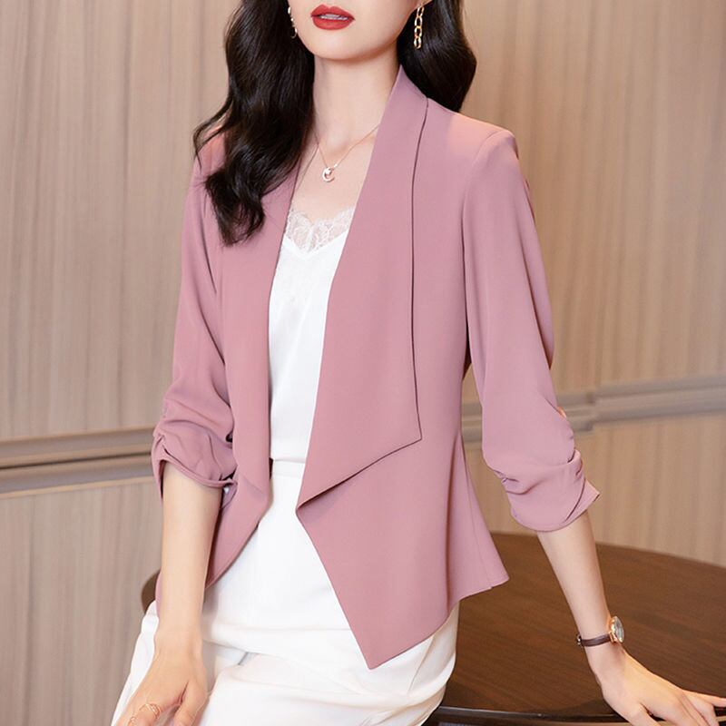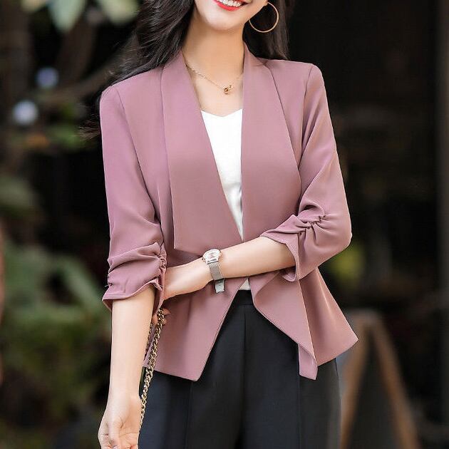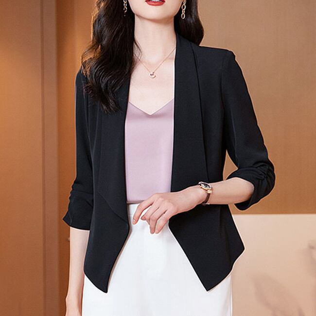 柔らかくなめらかな風合いのボタンレスジャケット。 上品な折り返し襟とシャーリング加工が施された七分袖がポイント。