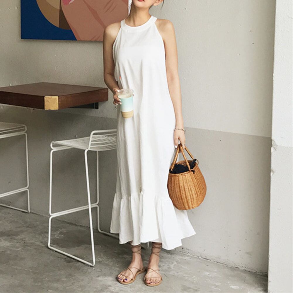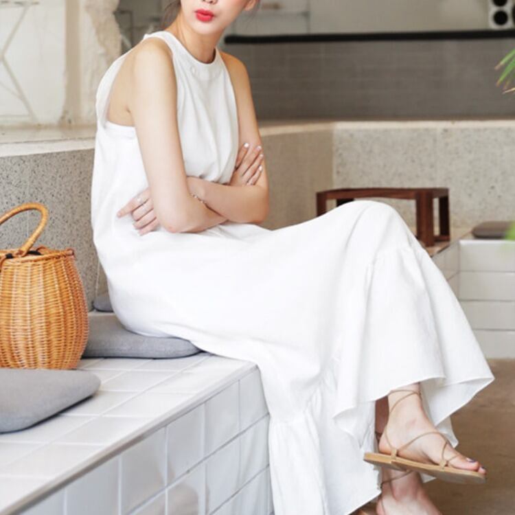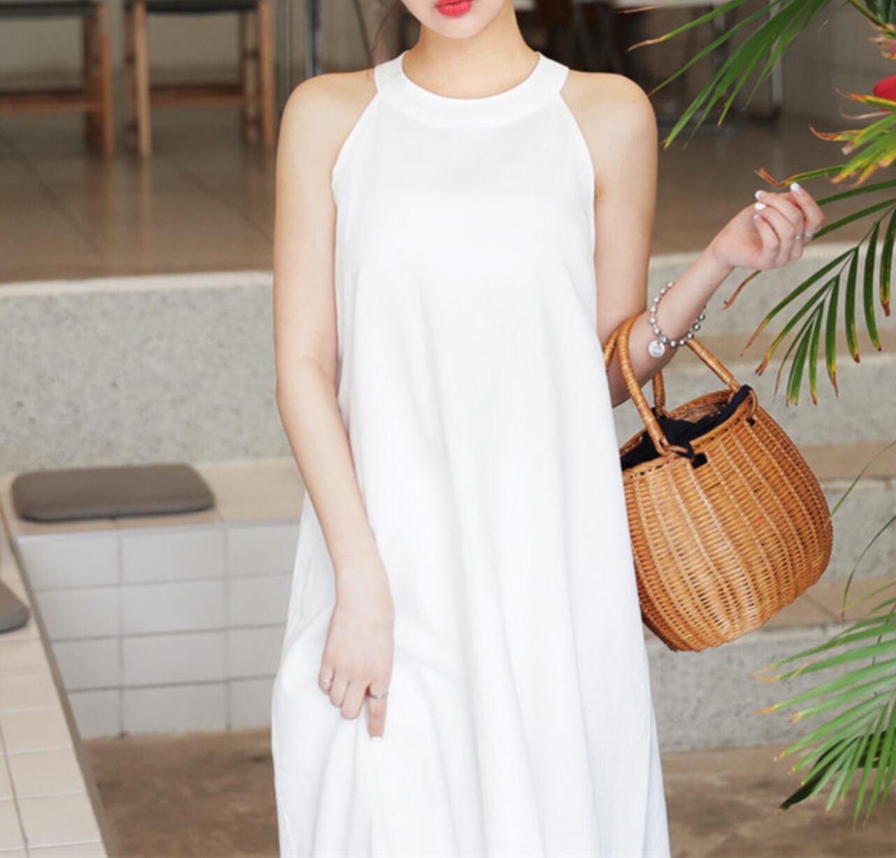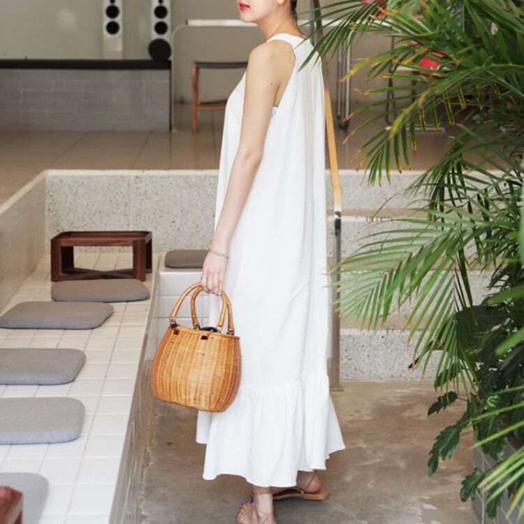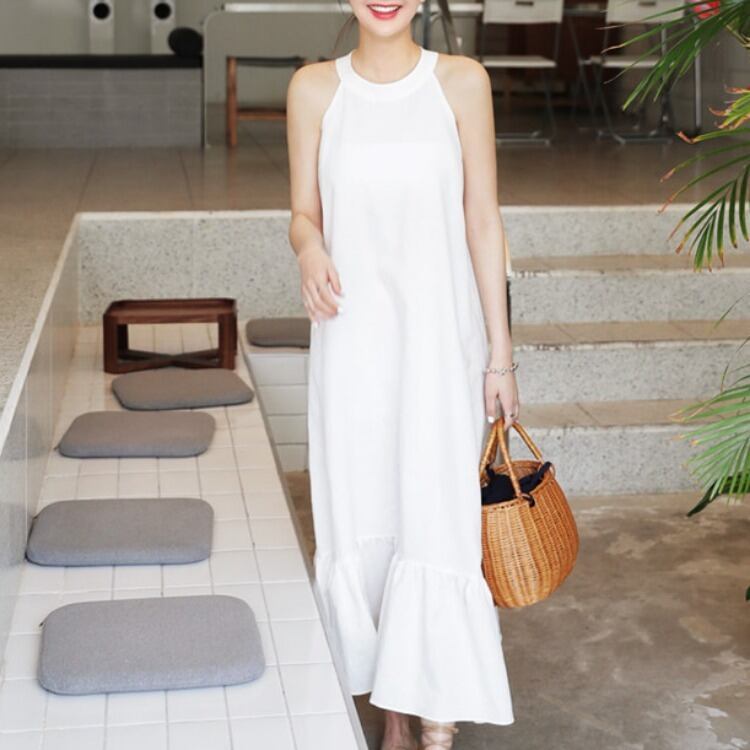 シンプルでナチュラルなラインのロングホルターネックワンピース。