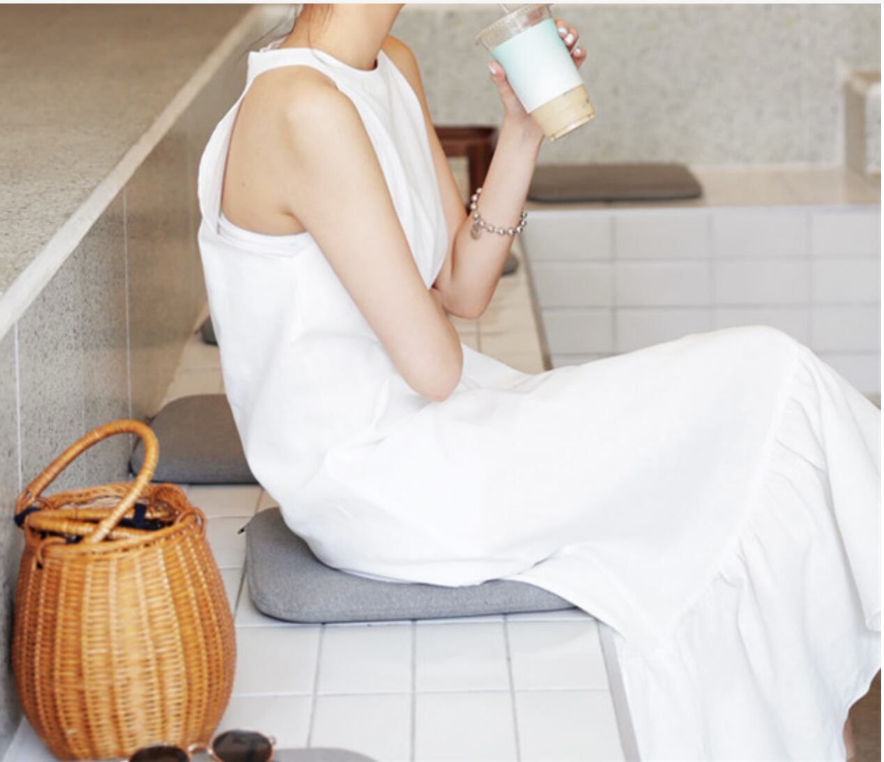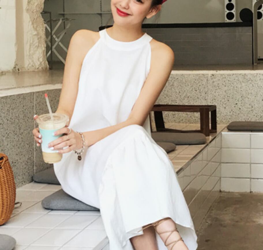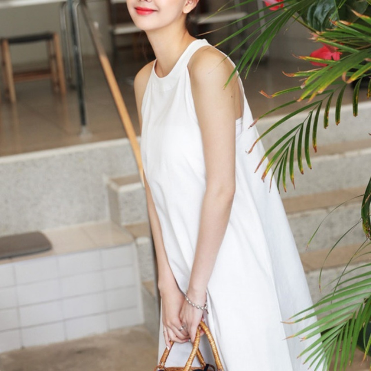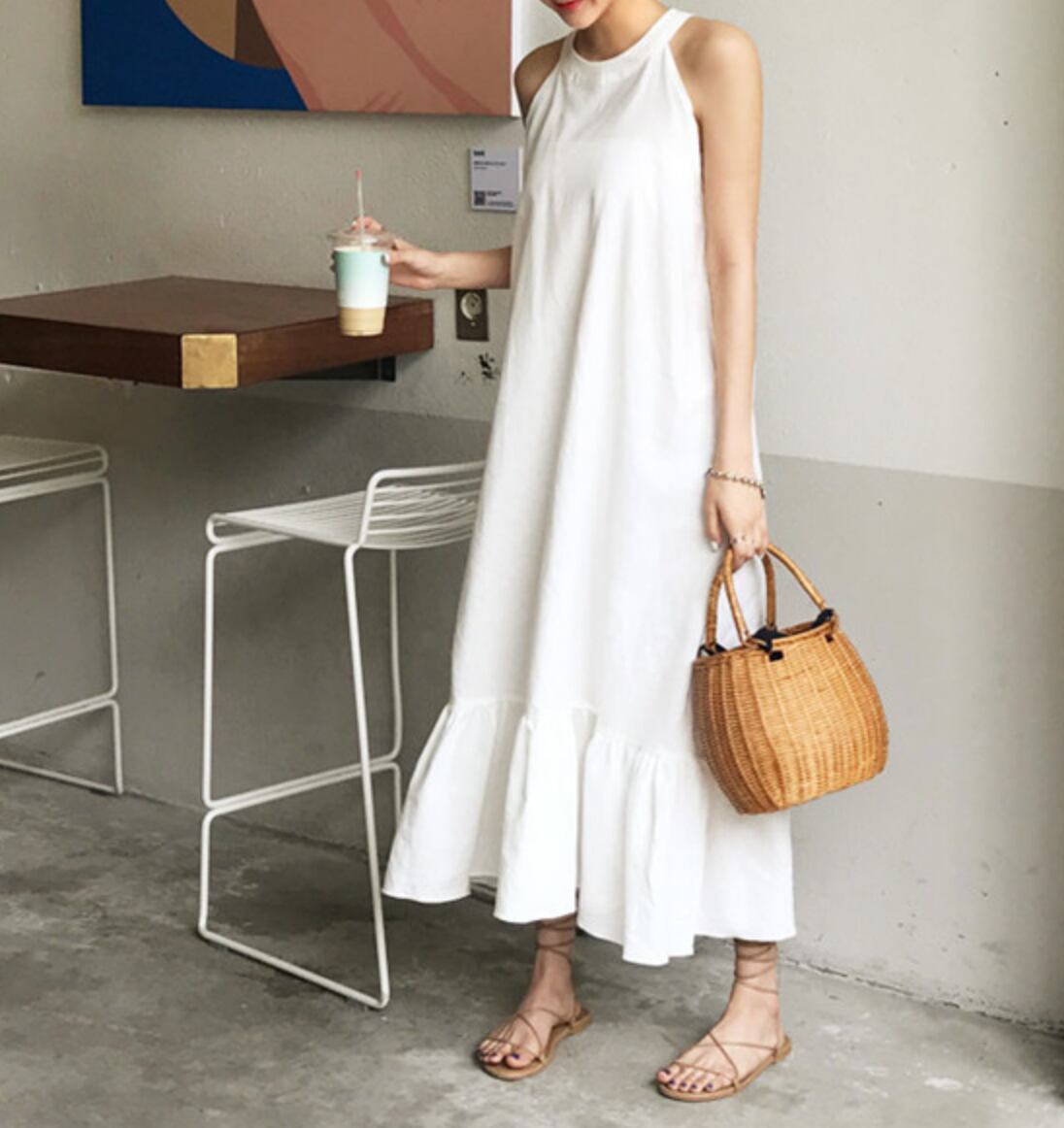 シンプルでナチュラルなラインのロングホルターネックワンピース。