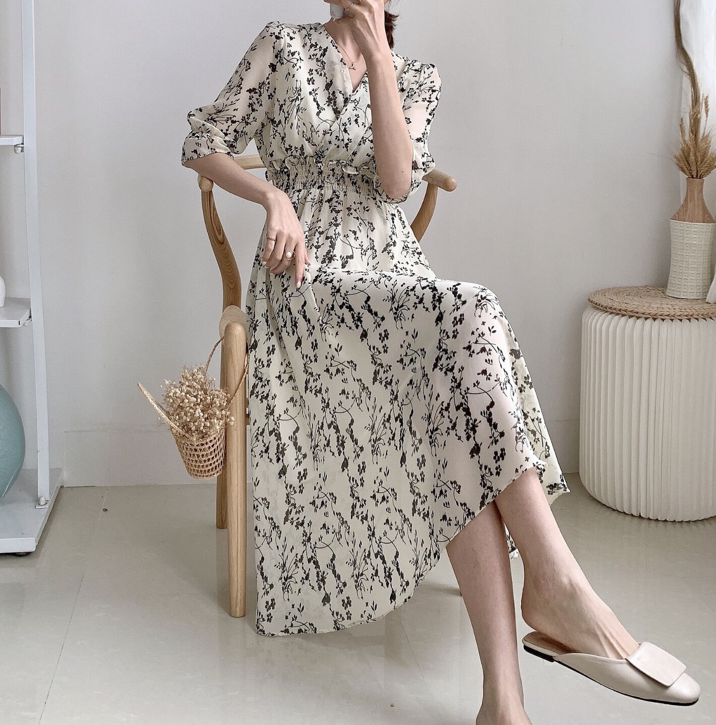 フローラルプリントが可愛いふんわりロングワンピース。