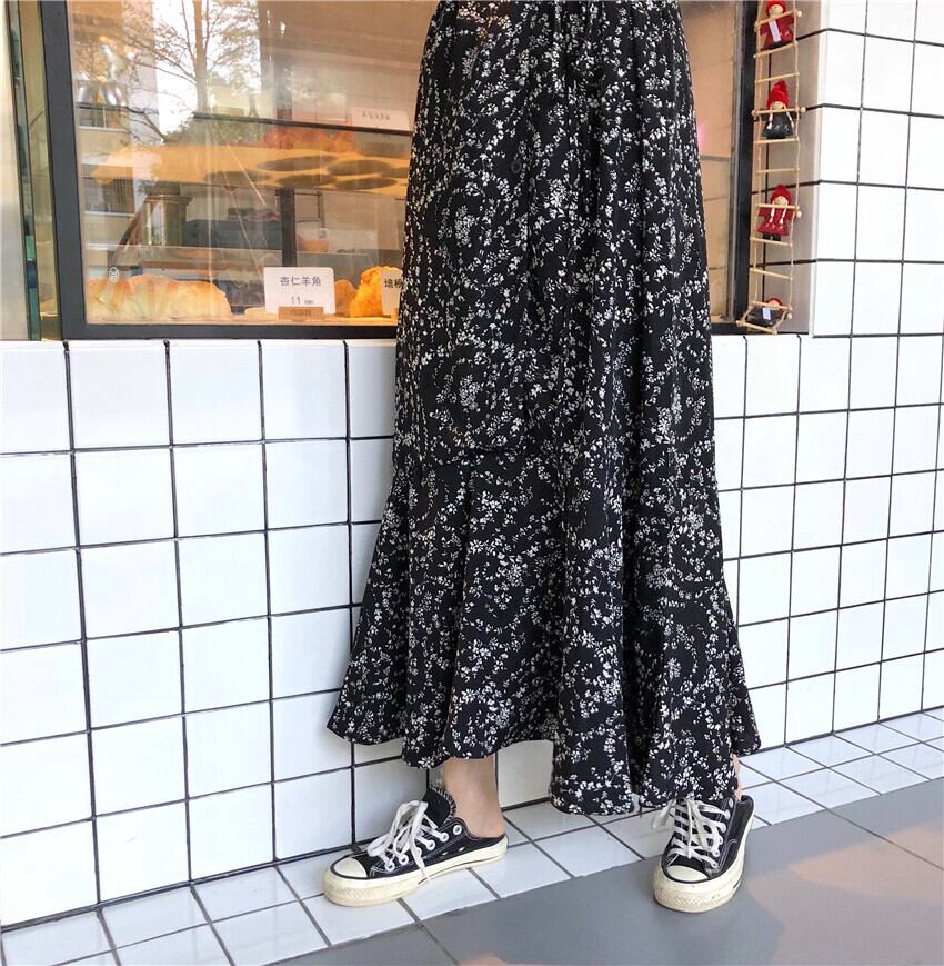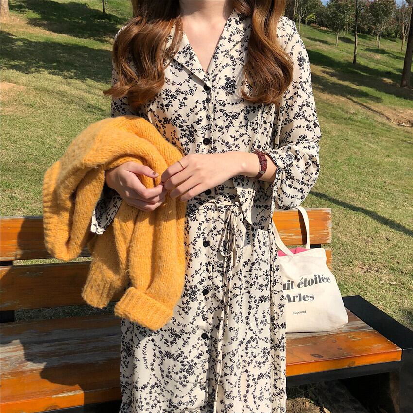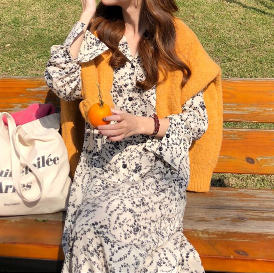レトロなフローラルプリントのロングシャツワンピース。
