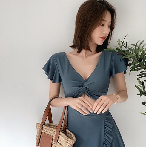 胸が広く開いていて鎖骨を綺麗に見せます。フリルデザインがポイント。