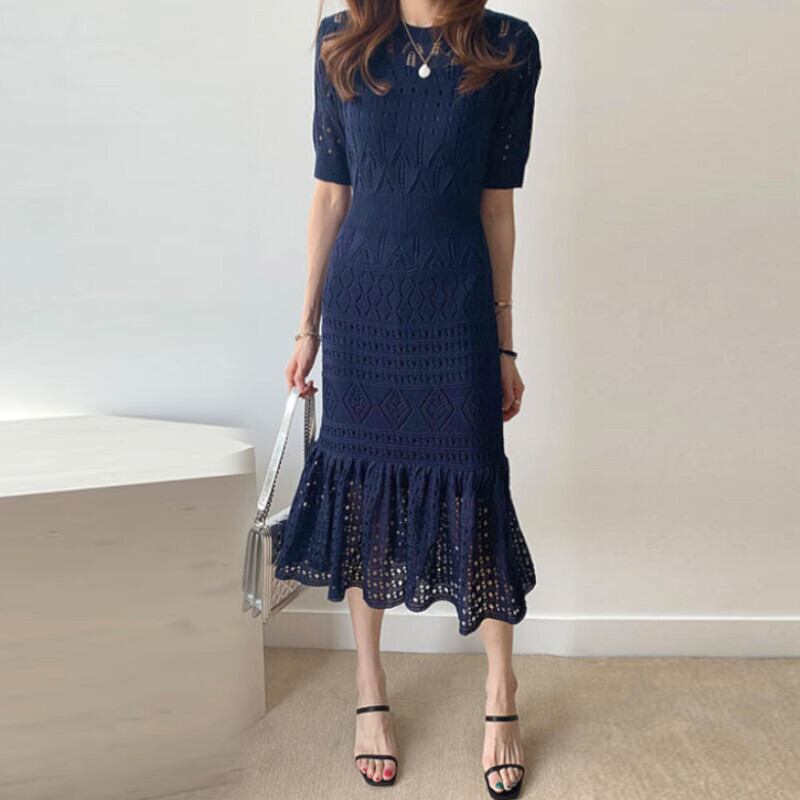 透かし編みデザインが大人フェミニン!ニットロングワンピース。