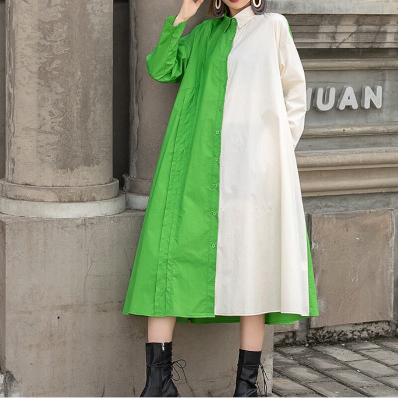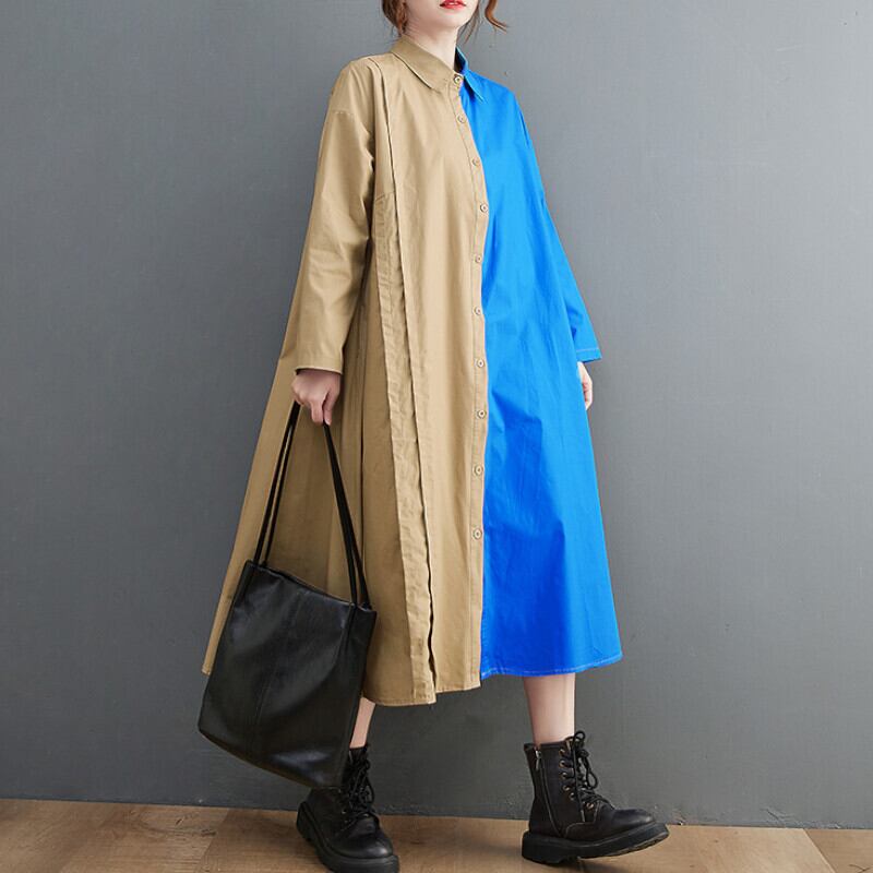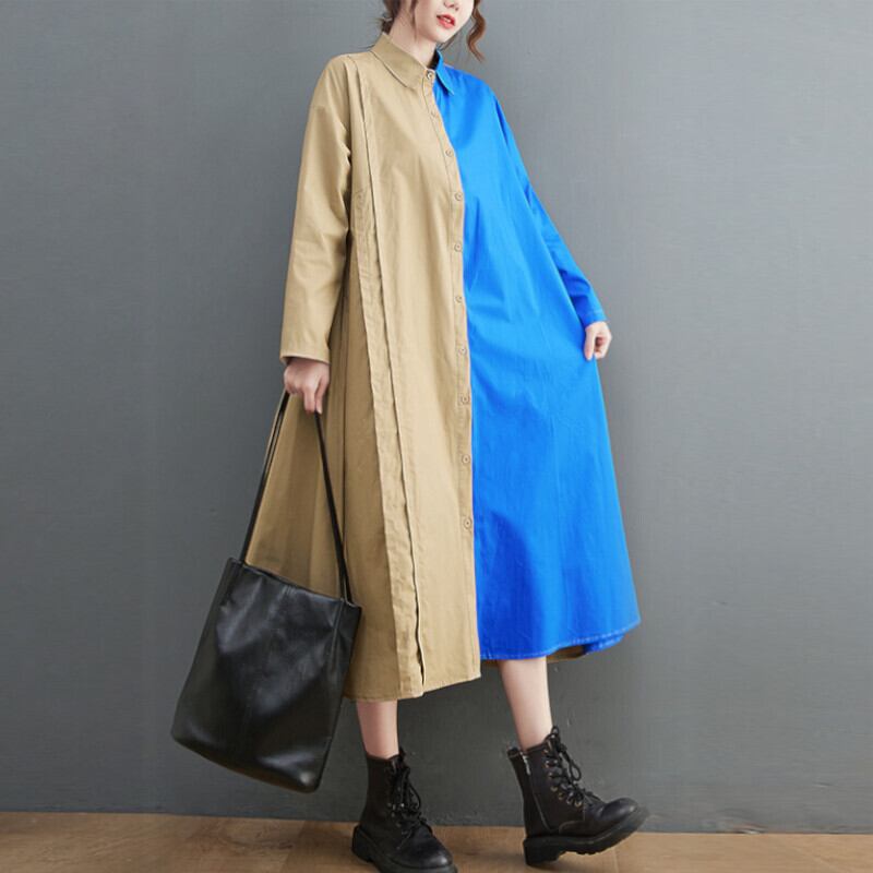 ワンピース ミドル丈 袖あり 長袖 フレア ゆったり 大人可愛い きれいめ シンプル カジュアル 大人 上品 おしゃれ かっこいい レトロ 個性的 バイカラー コントラストカラー 春 夏 10代 20代 30代 40代 レディース デート お出かけ 女子会 休日 パーティー 韓国系 オルチャン ファッション コーデ スタイル モテ 体型カバー トレンド L XL ワンサイズ 黒 ブラック ブルー