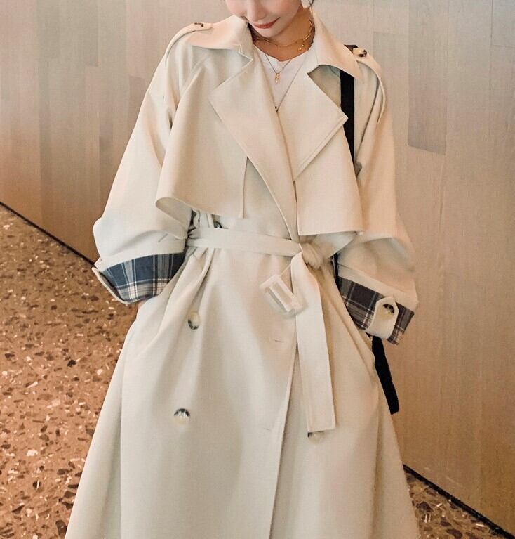 袖のチェックの切り替えがアクセントになったトレンチコートです。