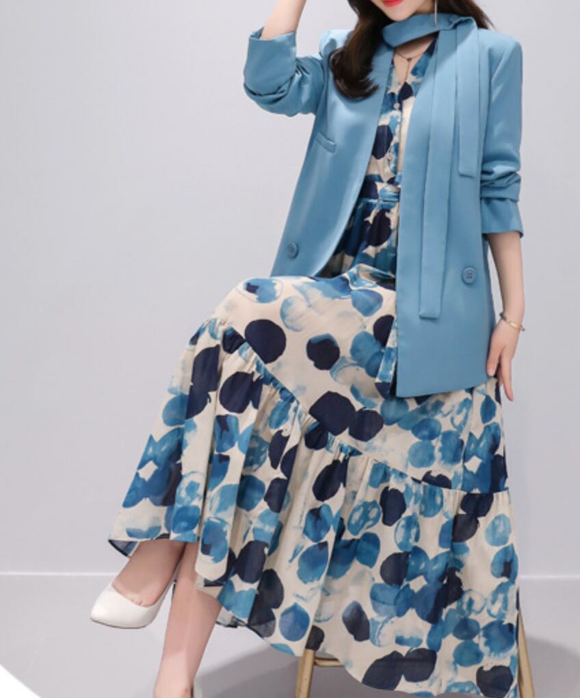 ふんわりフレアロングワンピースとジャケットのセットアップ。
