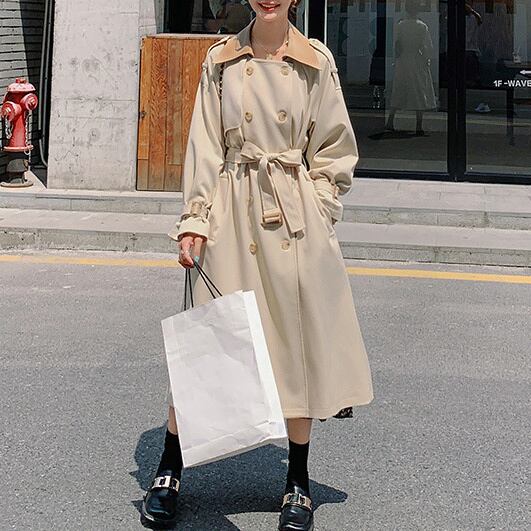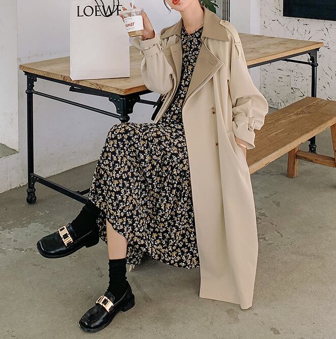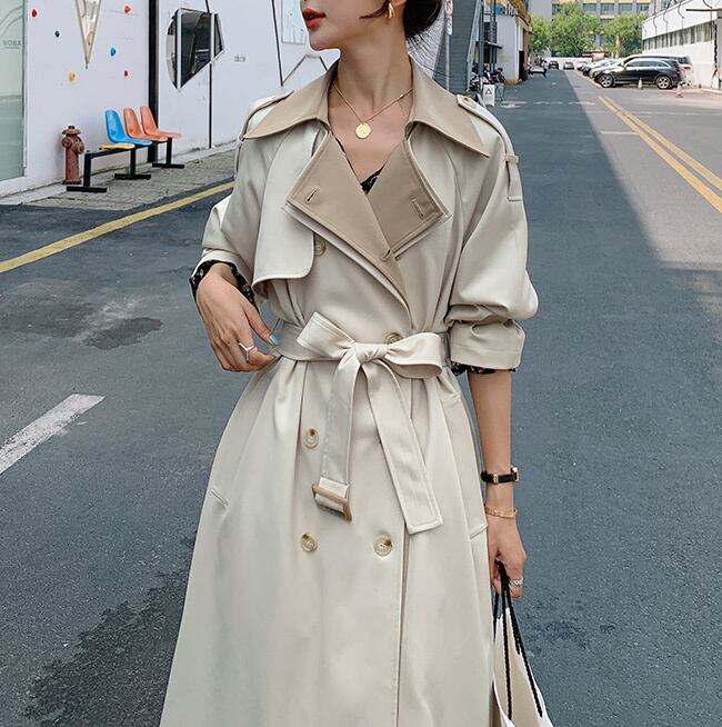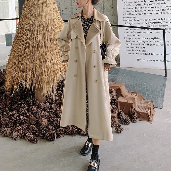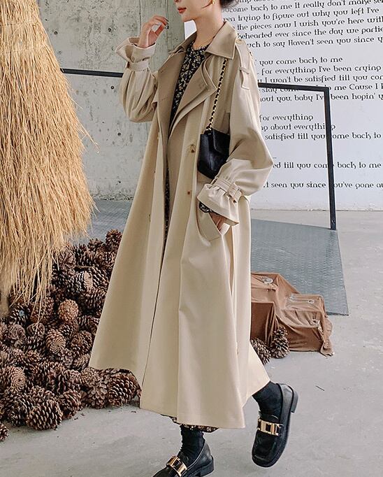 ナチュラルな配色でオトナっぽい雰囲気を演出するロングトレンチコート。