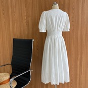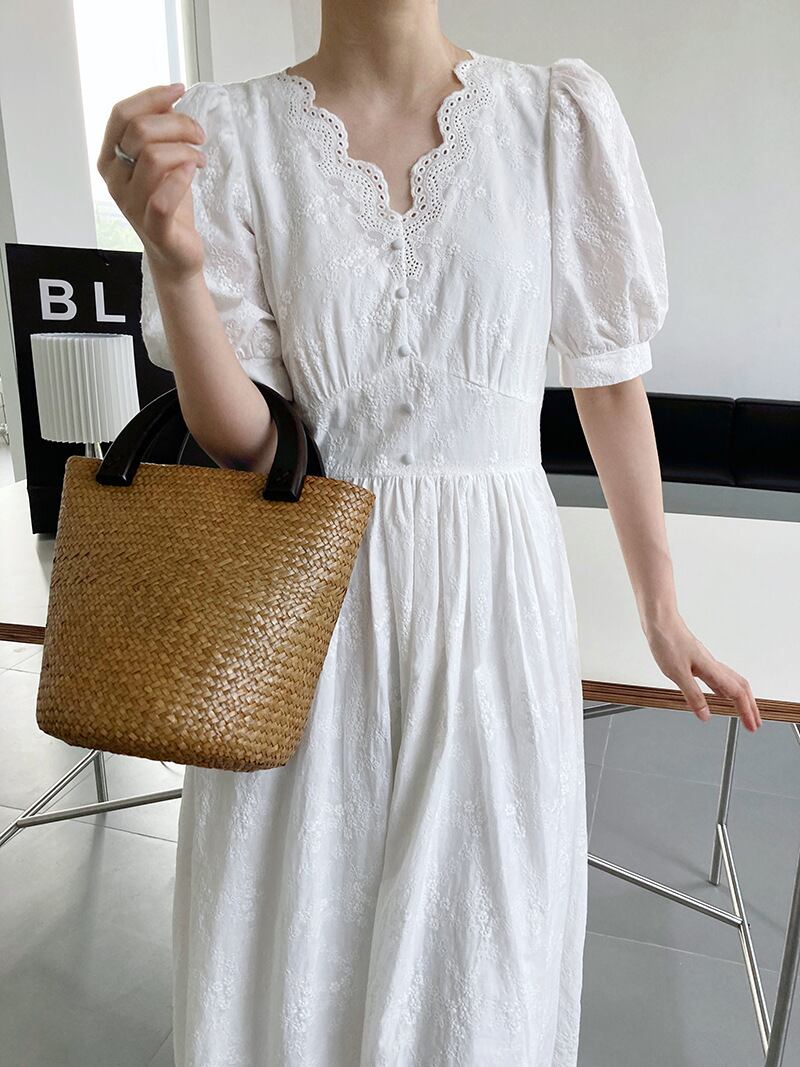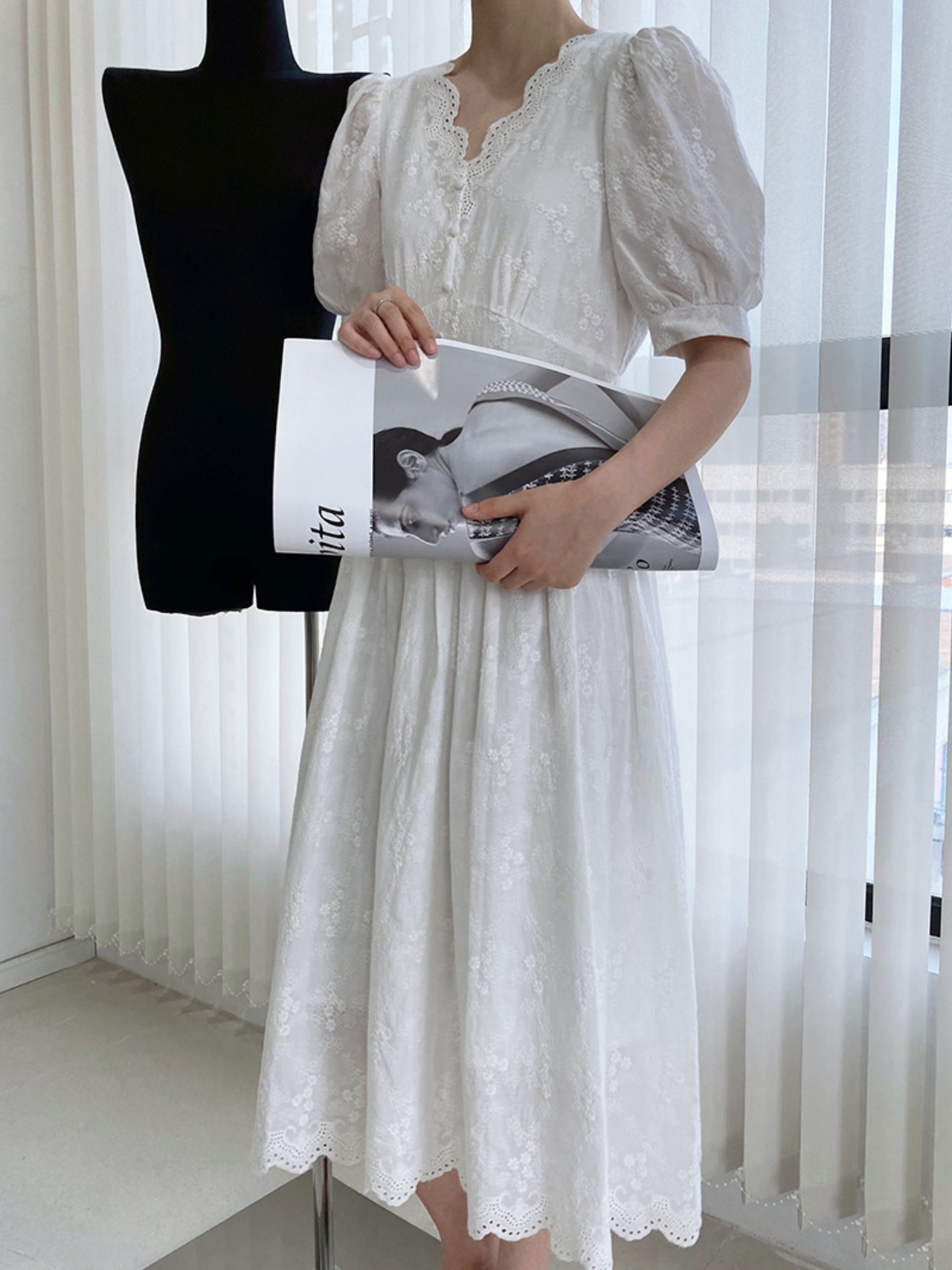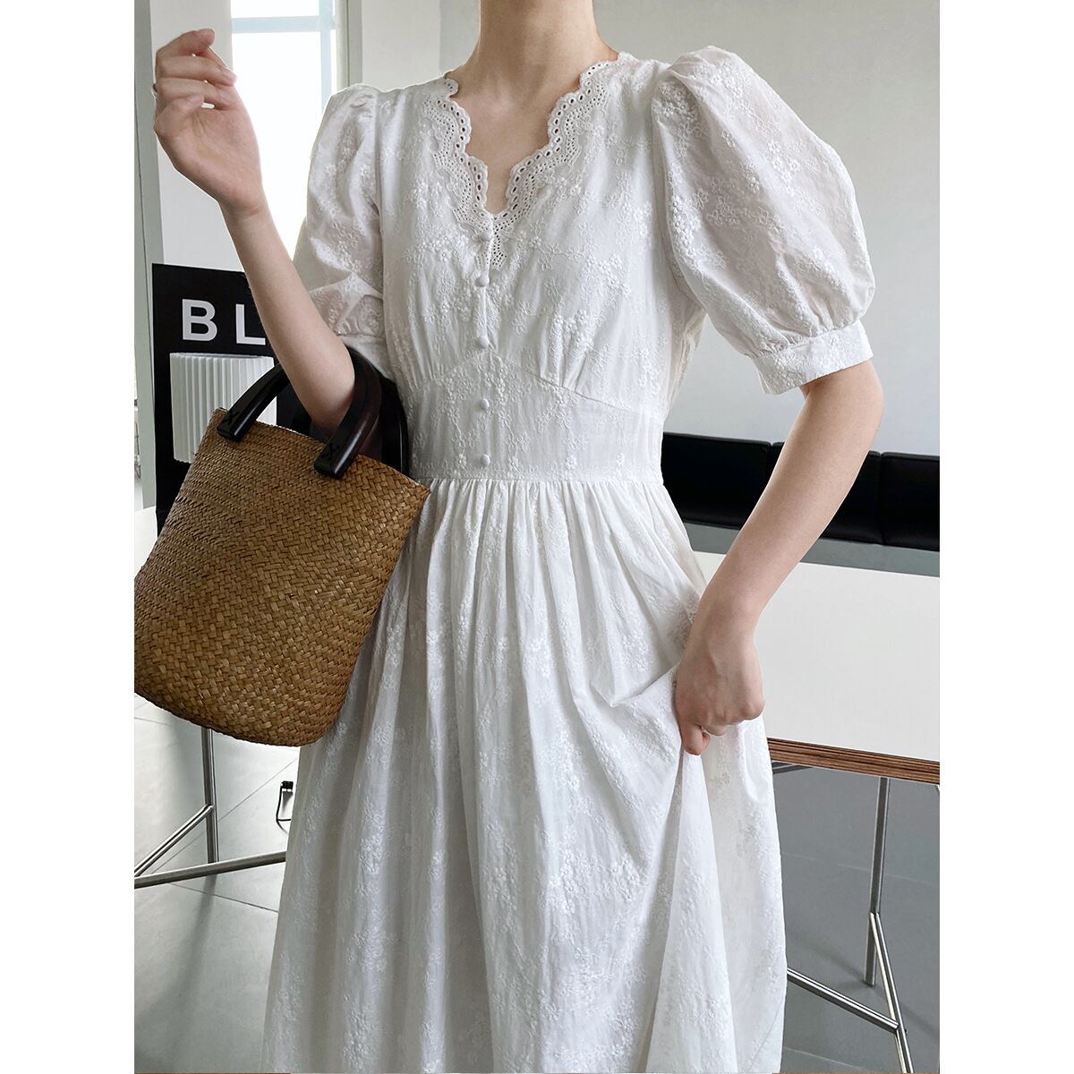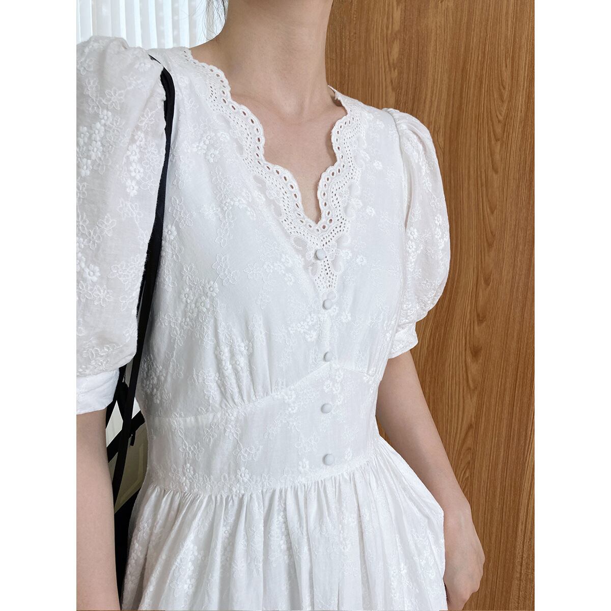 ワンピース 上着 人気 おすすめ おしゃれ お洒落 激安 安い 送料無料 プチプラ 半袖 Vネック ふわふわ パフスリーブ ふんわり Aライン 膝丈 花柄 レース 可愛い かわいい 韓国 シンプル カジュアル きれいめ 大人 上品 春 スプリング サマー 夏 レディース 女性用 20代 30代 M L 白 ホワイト パステルカラー 大人カラー モノトーン 春カラー デート フェミニン エレガント ナチュラル