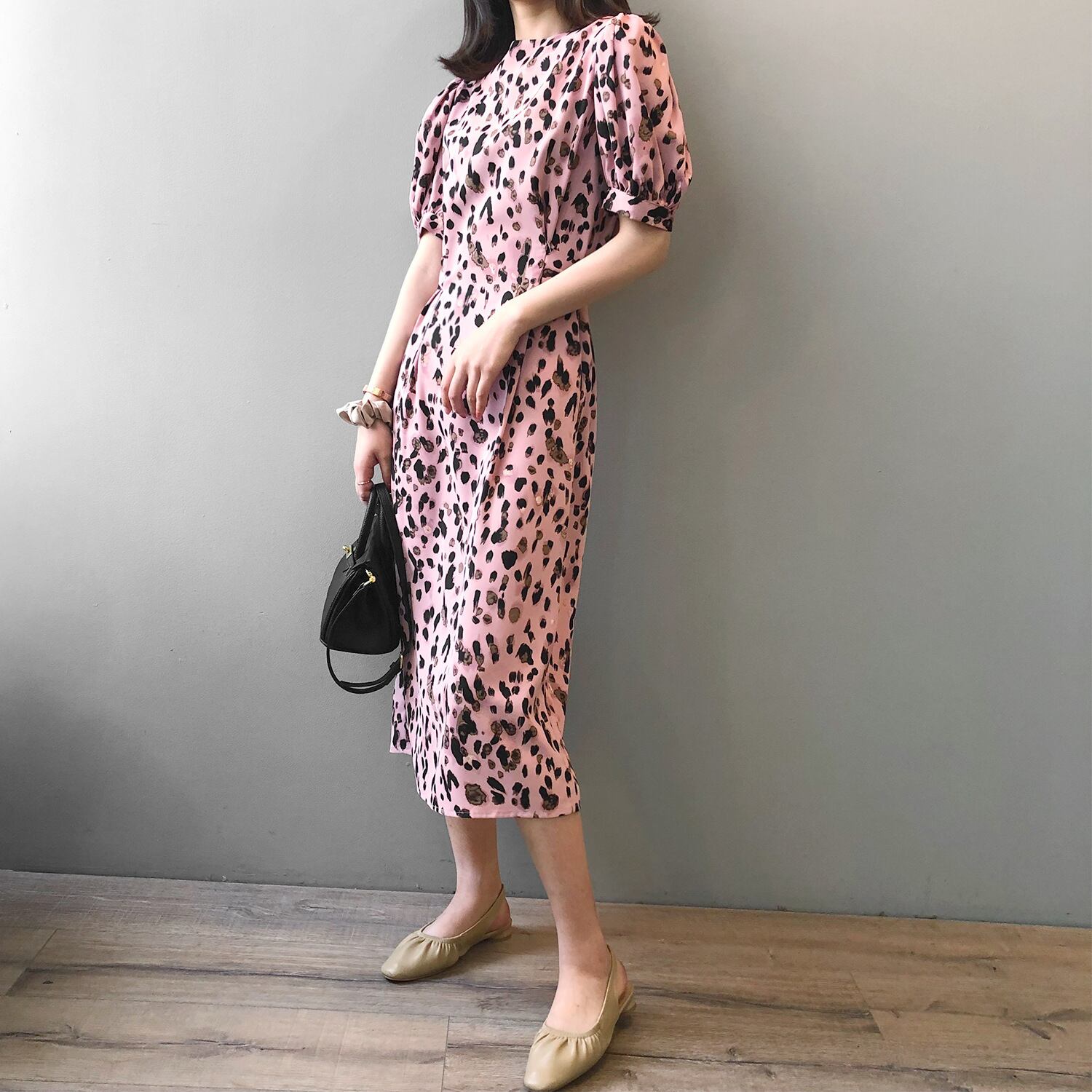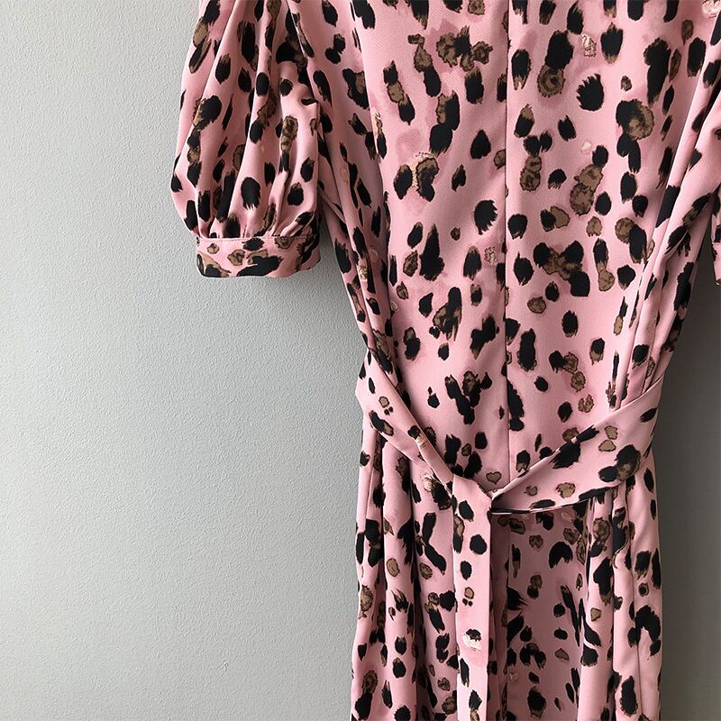 ワンピース 上着 人気 おすすめ おしゃれ お洒落 激安 安い 送料無料 プチプラ 半袖 ラウンドネック 丸首 ふわふわ パフスリーブ ふんわり 膝丈 柄 ヒョウ柄 ポリエステル 可愛い かわいい 韓国 シンプル きれいめ 大人 上品 フォーマル 春 スプリング サマー 夏 レディース 女性用 20代 30代 M L XL 黒 ブラック 桃色 ピンク パステルカラー 大人カラー バイカラー 春カラー デート フェミニン