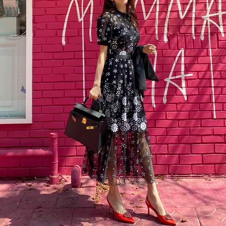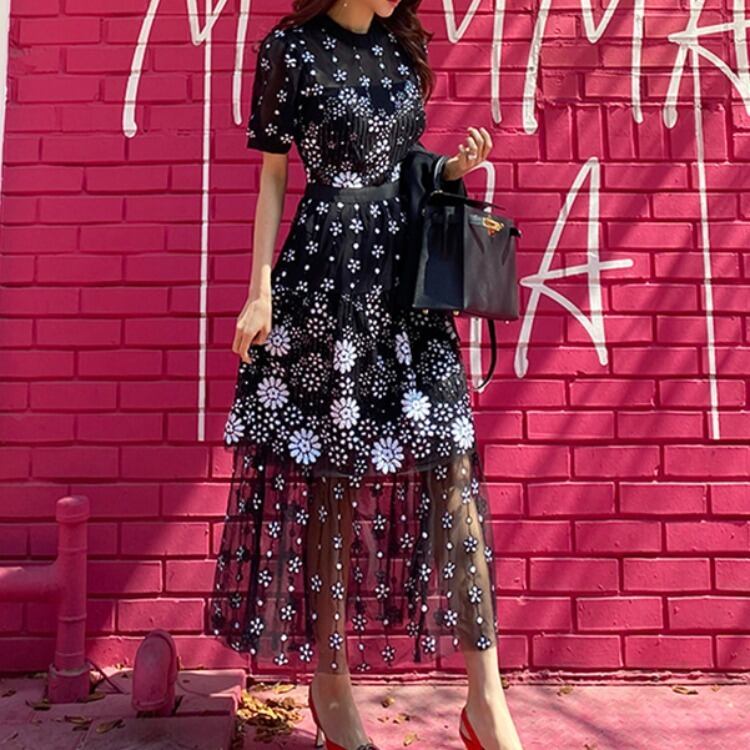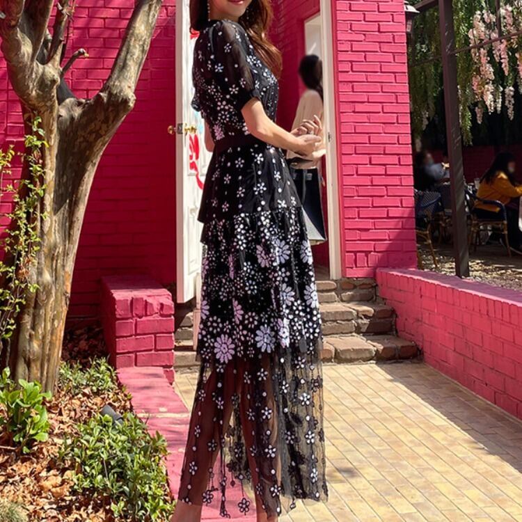 エレガントなシースルー生地のロングワンピース。