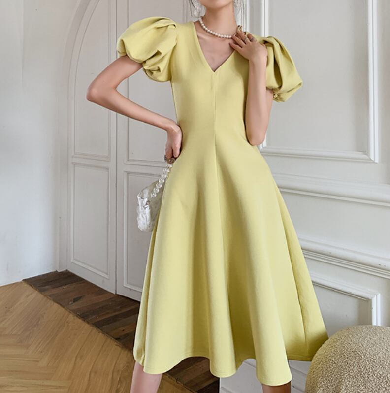 ワンピース 上着 人気 おすすめ おしゃれ お洒落 激安 安い 送料無料 プチプラ 半袖 Vネック ふわふわ パフスリーブ ふんわり Aライン 膝丈 ミニスカート 無地 可愛い かわいい 韓国 シンプル きれいめ 高品質 大人 上品 春 スプリング サマー 夏 結婚式 レディース 女性用 20代 30代 S M L XL 黄色 イエロー パステルカラー くすみカラー 大人カラー 春カラー デート フェミニン