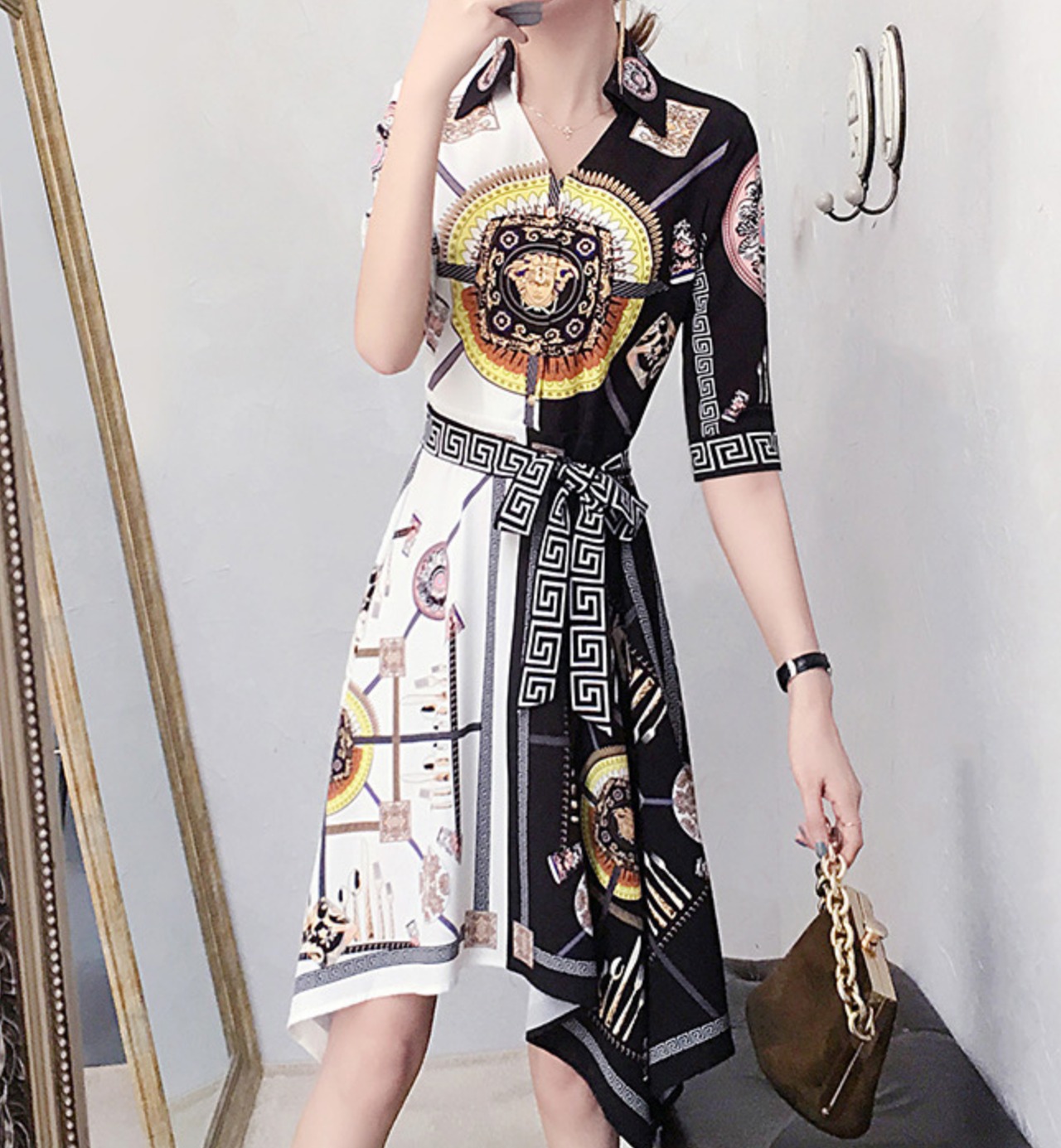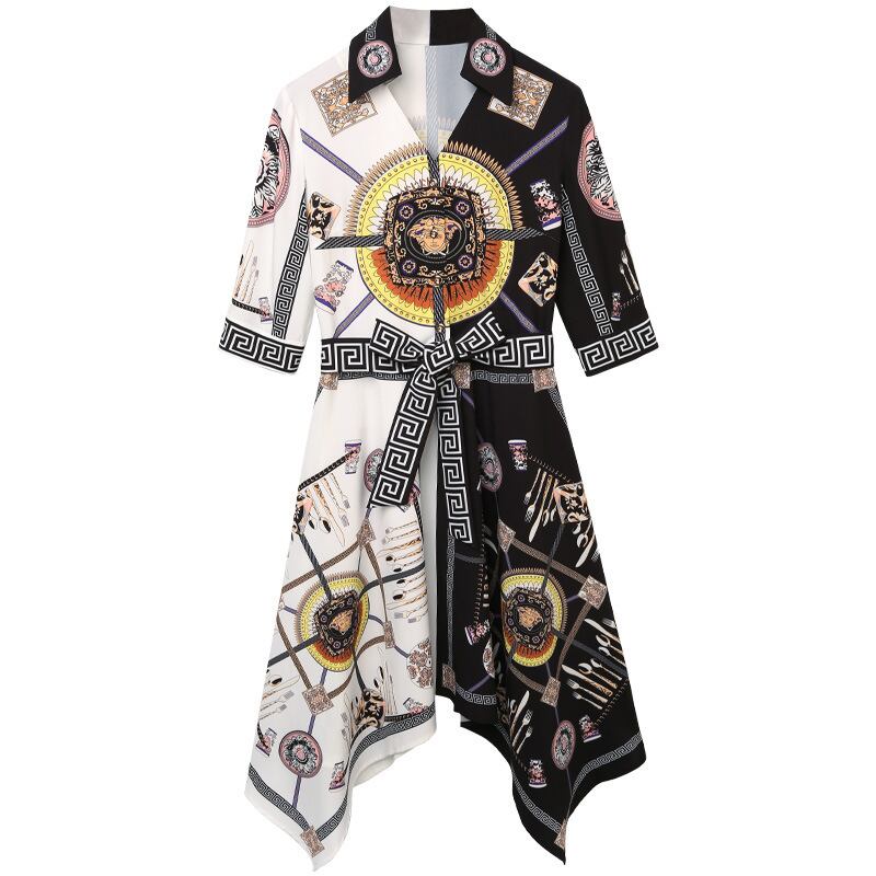 ワンピース 上着 人気 おすすめ おしゃれ お洒落 激安 安い 送料無料 プチプラ シャツ 半袖 Vネック Aライン 膝丈 柄 シフォン 可愛い かわいい 韓国 きれいめ 高品質 大人 上品 フォーマル 春 スプリング サマー 夏 レディース 女性用 20代 30代 S M L XL 2XL 白 ホワイト 黒 ブラック 大人カラー 秋カラー カラバリ デート フェミニン エレガント マルチカラー シック
