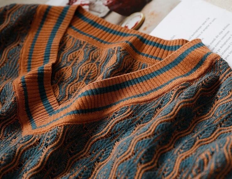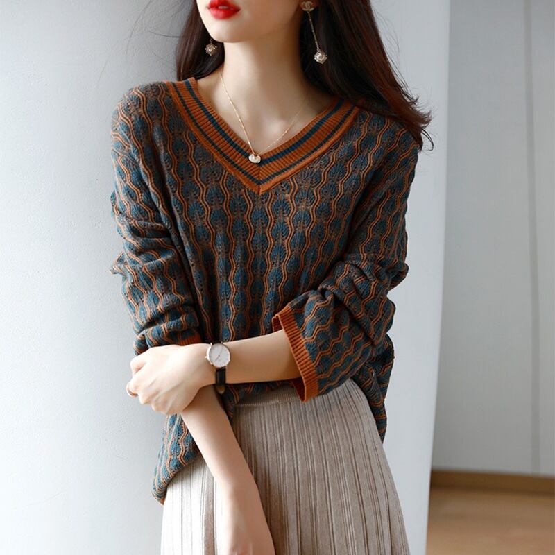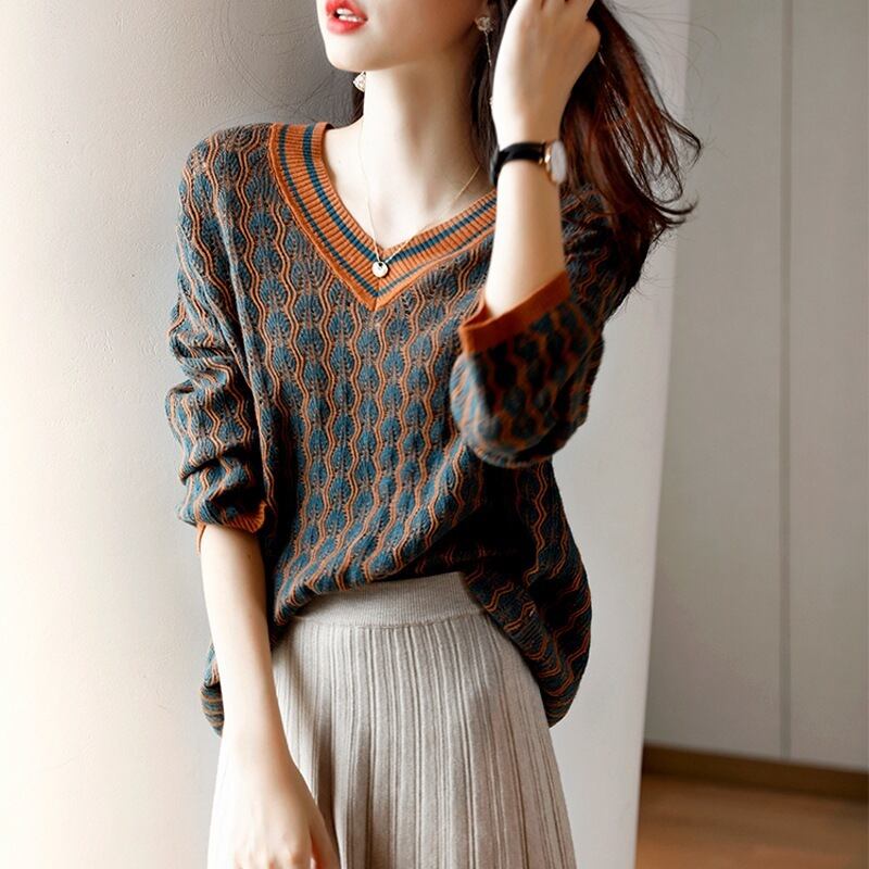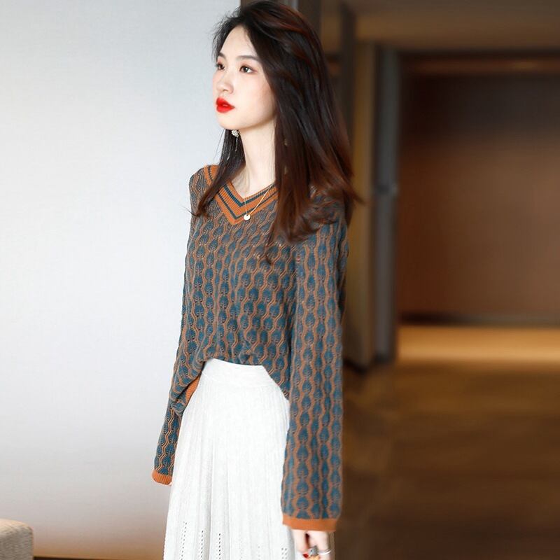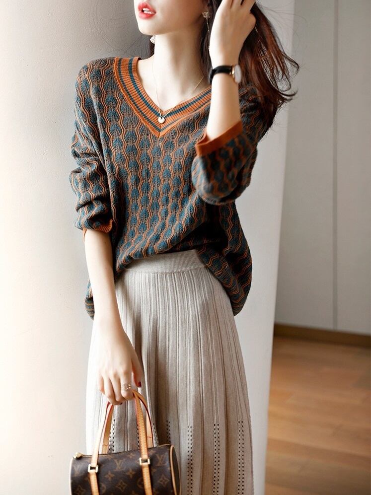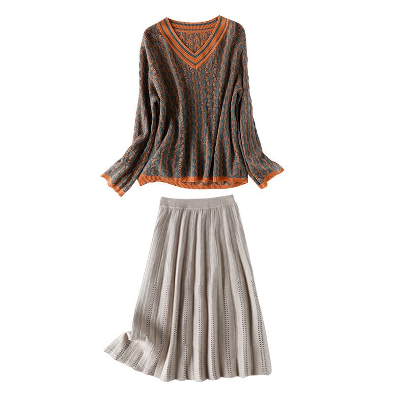 シーズンムード高まるVネックセーターとニットスカートのセットアップです。