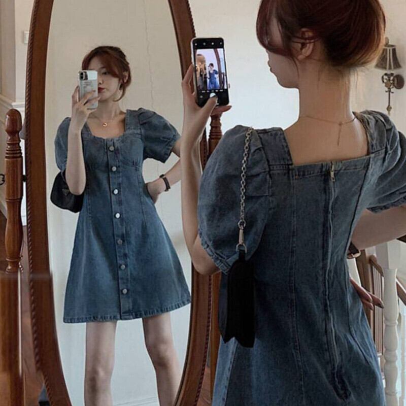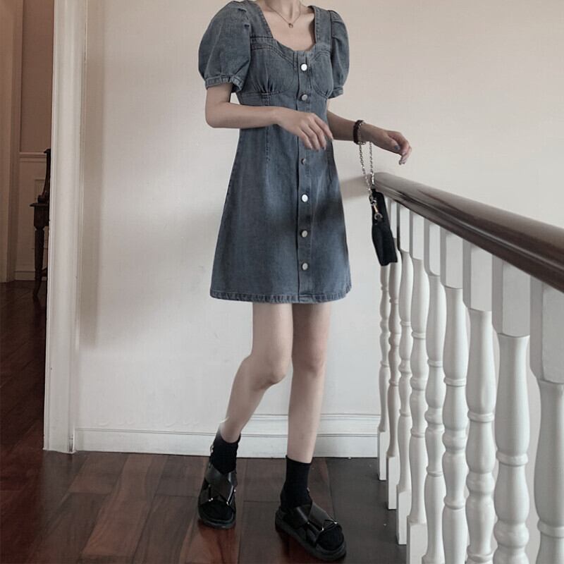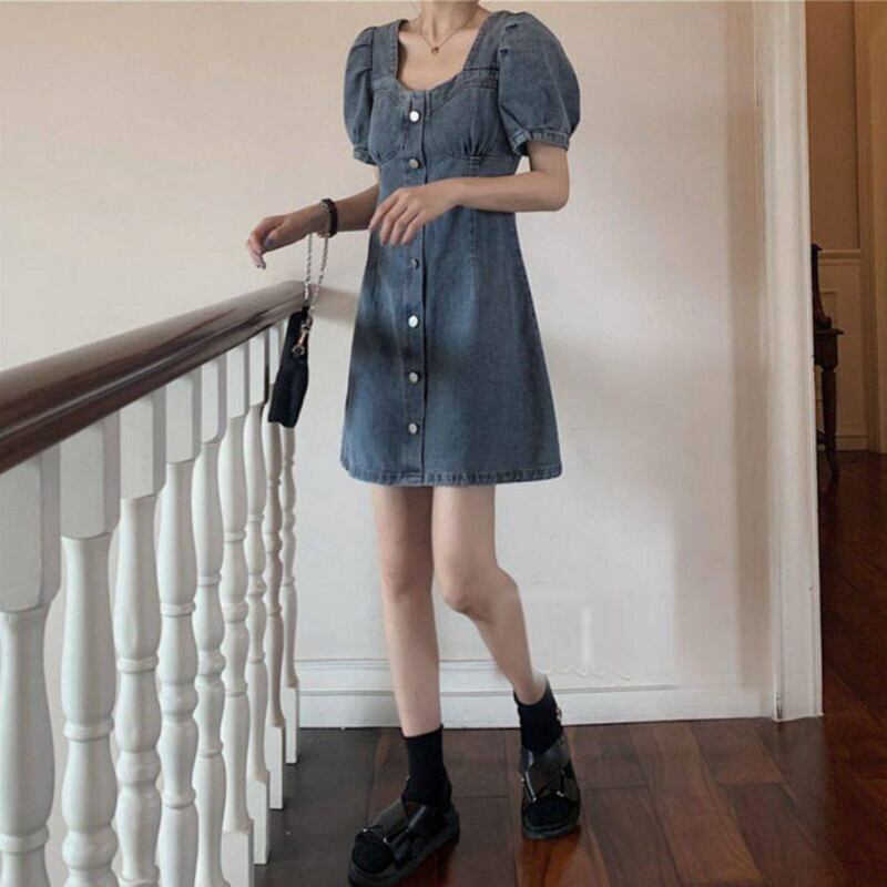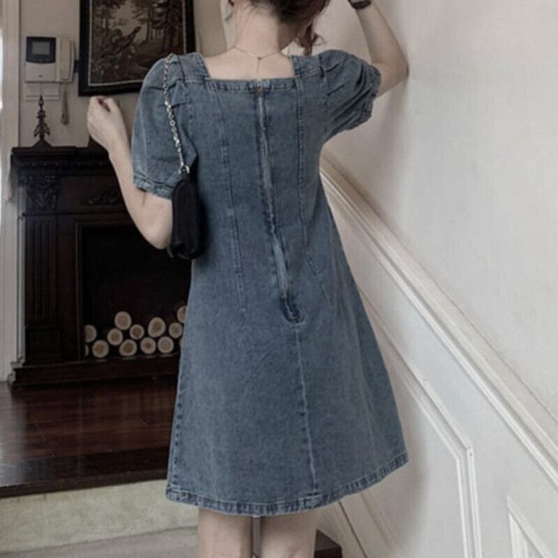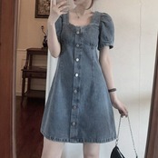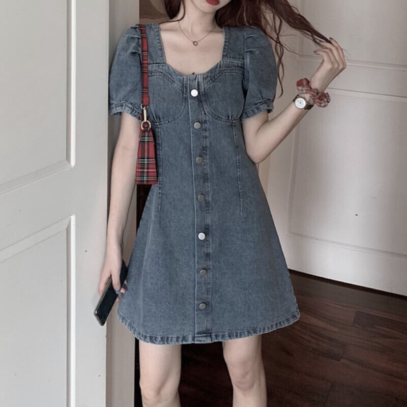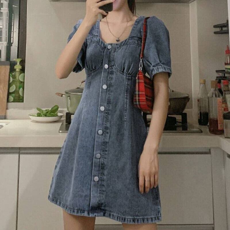スカート ワンピース デニムワンピース ショート丈 袖あり 半袖 パフスリーブ スクエアネック Aライン かわいい 大人可愛い きれいめ シンプル カジュアル おしゃれ レトロ こなれ感 ラフ キュート 無地 春 夏 10代 20代 30代 レディース 学生 デート お出かけ 女子会 休日 着回し 普段使い オルチャン ファッション コーデ スタイル モテ 体型カバー 脚長 S M L XL 2XL 3XL 大きいサイズ ブルー