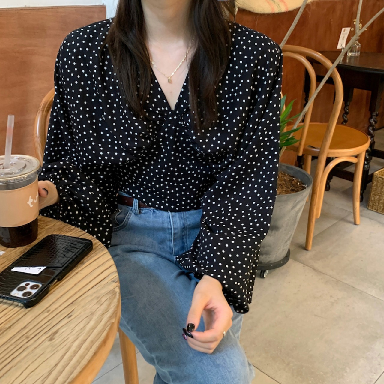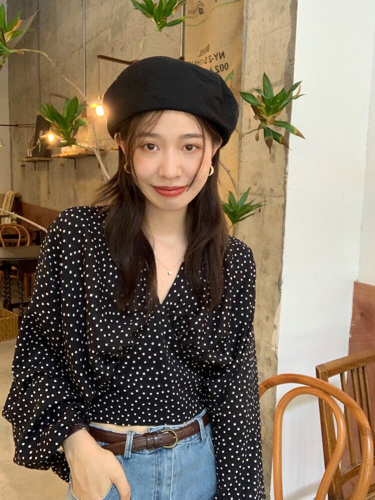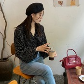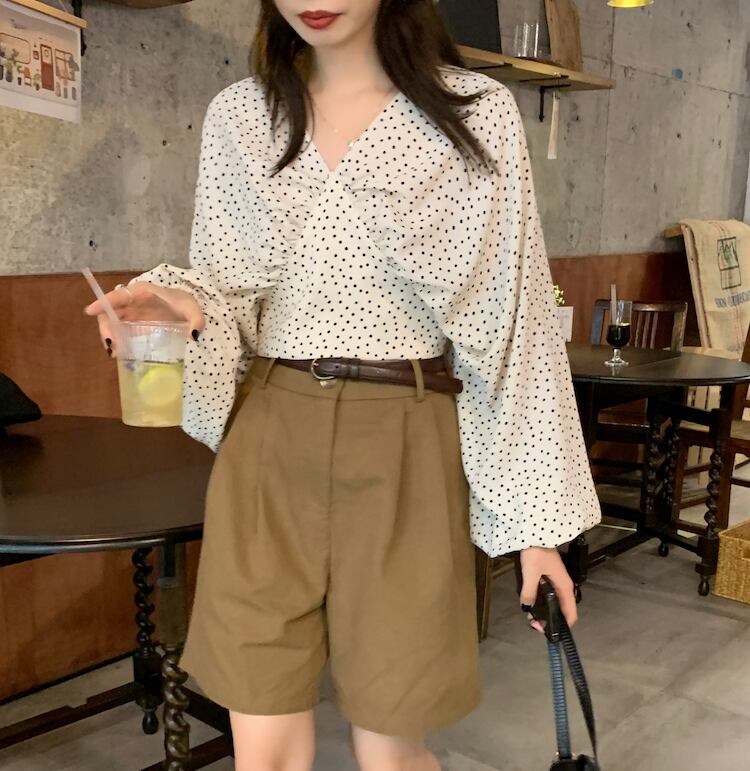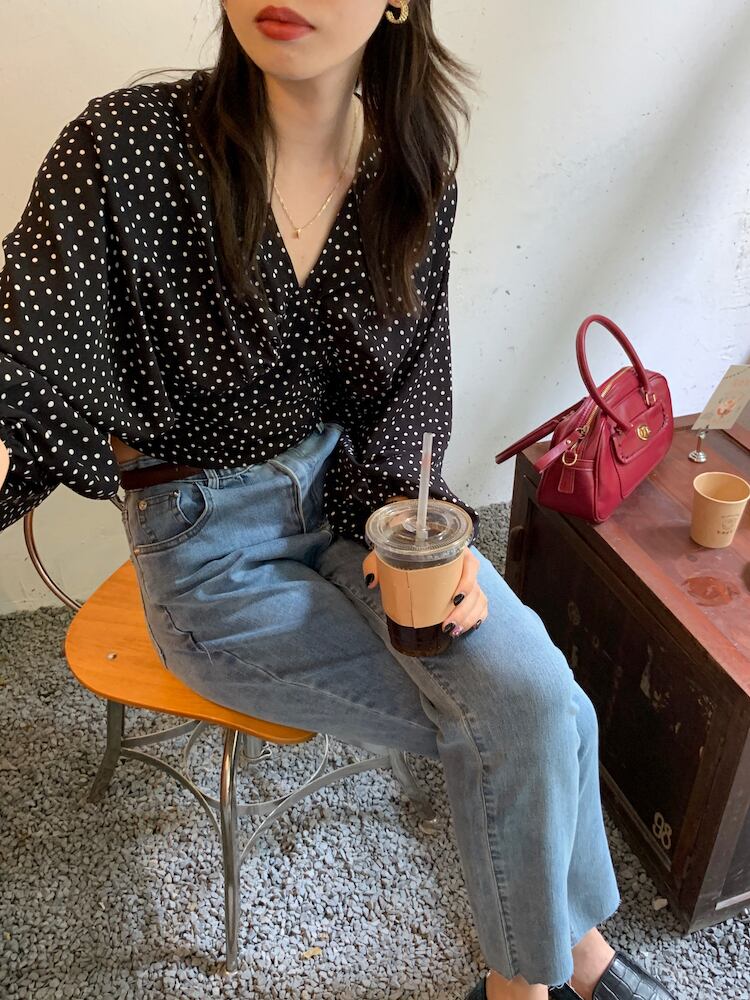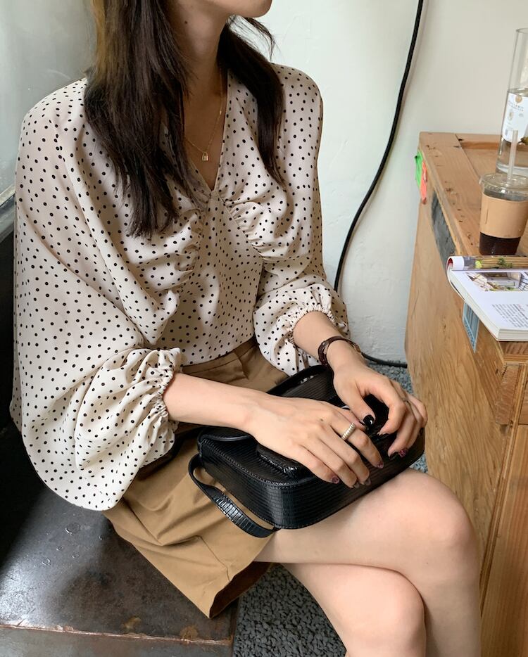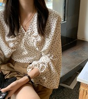 バックデザインがお洒落なドット柄ブラウス。