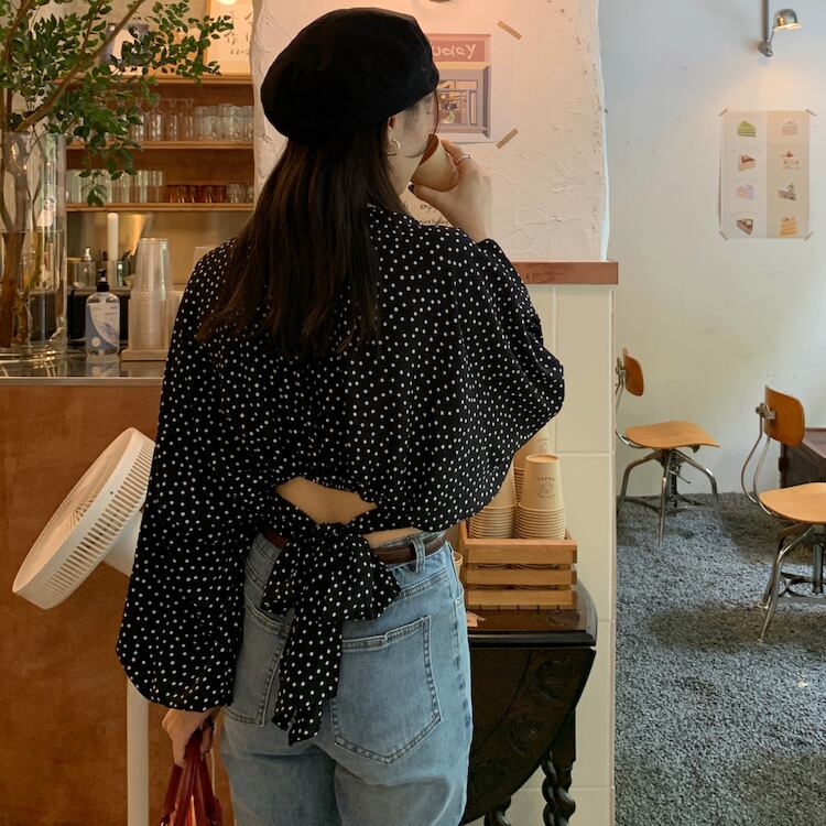 トップス ブラウス 白トップス ショート ショート丈 袖あり 長袖 パフスリーブ Vネック バックリボン バックシャン バックコンシャス かわいい 大人可愛い きれいめ シンプル カジュアル 大人 上品 おしゃれ お洒落 かっこいい レトロ 大人女子 こなれ感 ラフ マニッシュ ラブリー キュート ガーリー ルーズ 個性的 セクシー モダン 主役級 存在感 抜け感 フェミニン 大人カジュアル オフィスカジュアル オフィカジ 華やか 柄 ドット柄 水玉 春 夏 秋 10代 20代 30代 40代 レディース