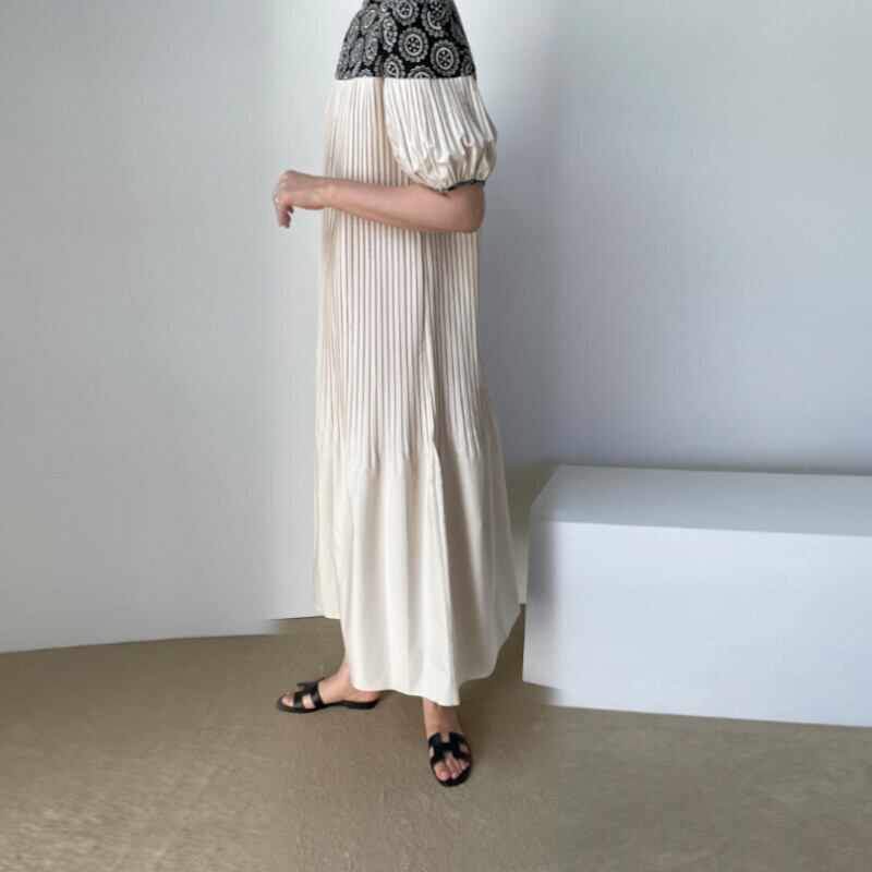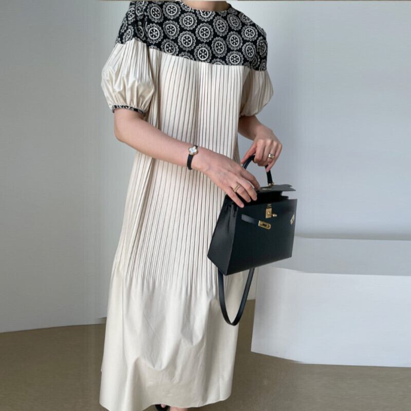 ワンピース 膝下 ミモレ丈 袖あり 半袖 ランタンスリーブ フレア プリーツ 大人可愛いきれいめ シンプル カジュアル 大人 上品 おしゃれ レトロ 大人女子 エレガント 花柄 幾何柄 春 秋 10代 20代 30代 40代 レディース デート お出かけ 女子会 着回し 普段使い オルチャン ファッション コーデ スタイル モテ 体型カバー ワンサイズ 白 ホワイト ブラック ベージュ バイカラー