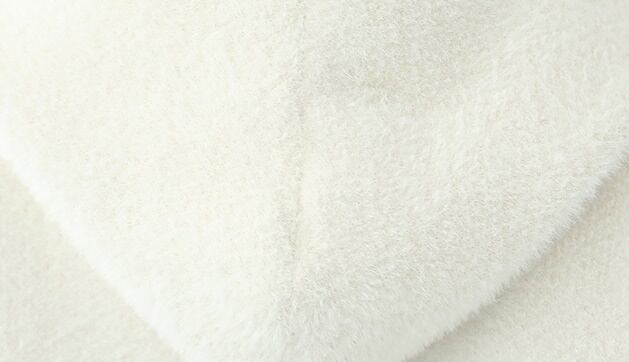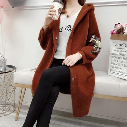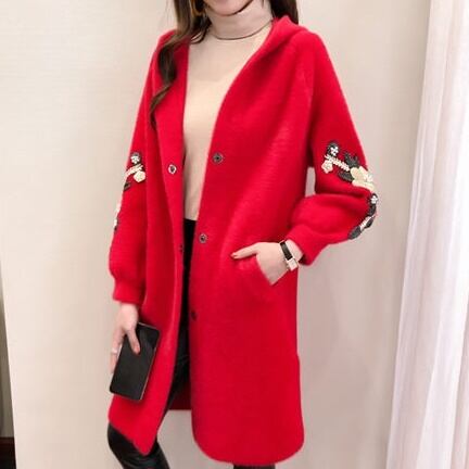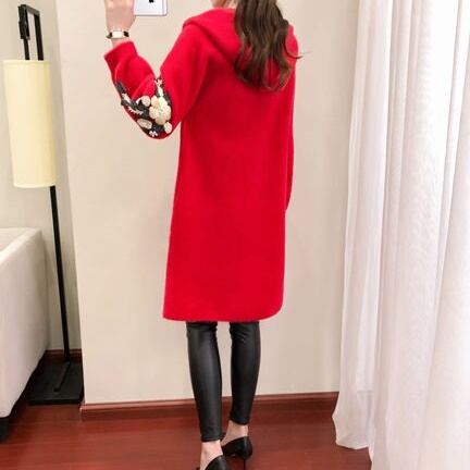 肘のビーズ刺繍が華やかなふわふわ起毛のフード付きコート。